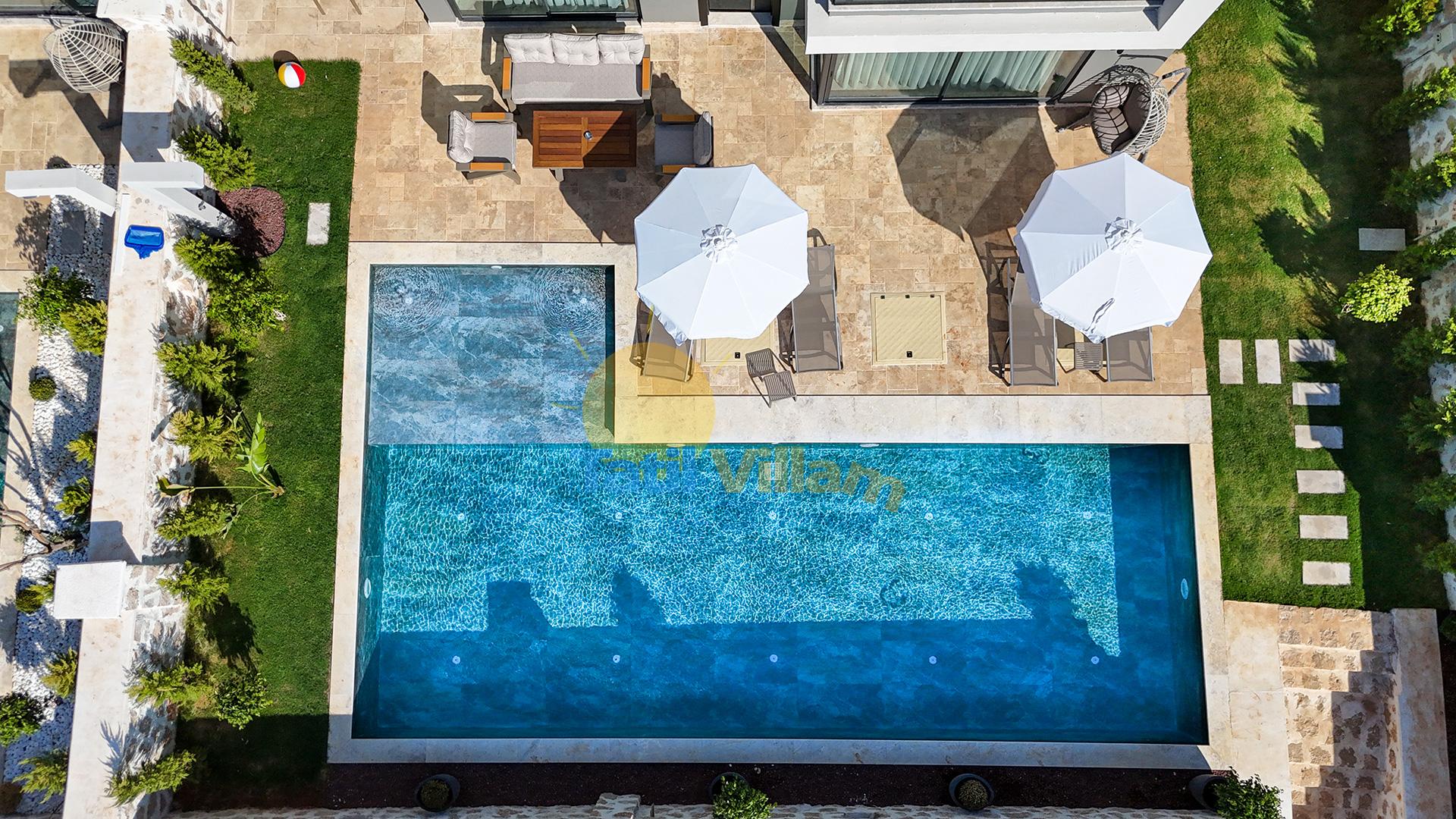 Giriş kat içerisinde, havuz terasına açılan bir salon ve yine açık amerikan mutfak sizleri karşılamaktadır.