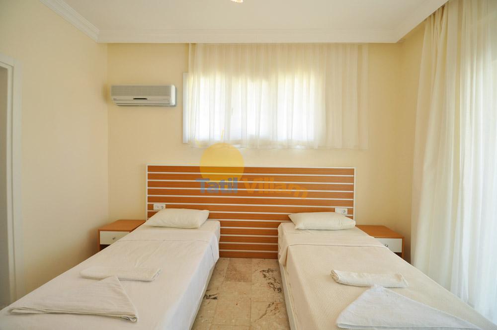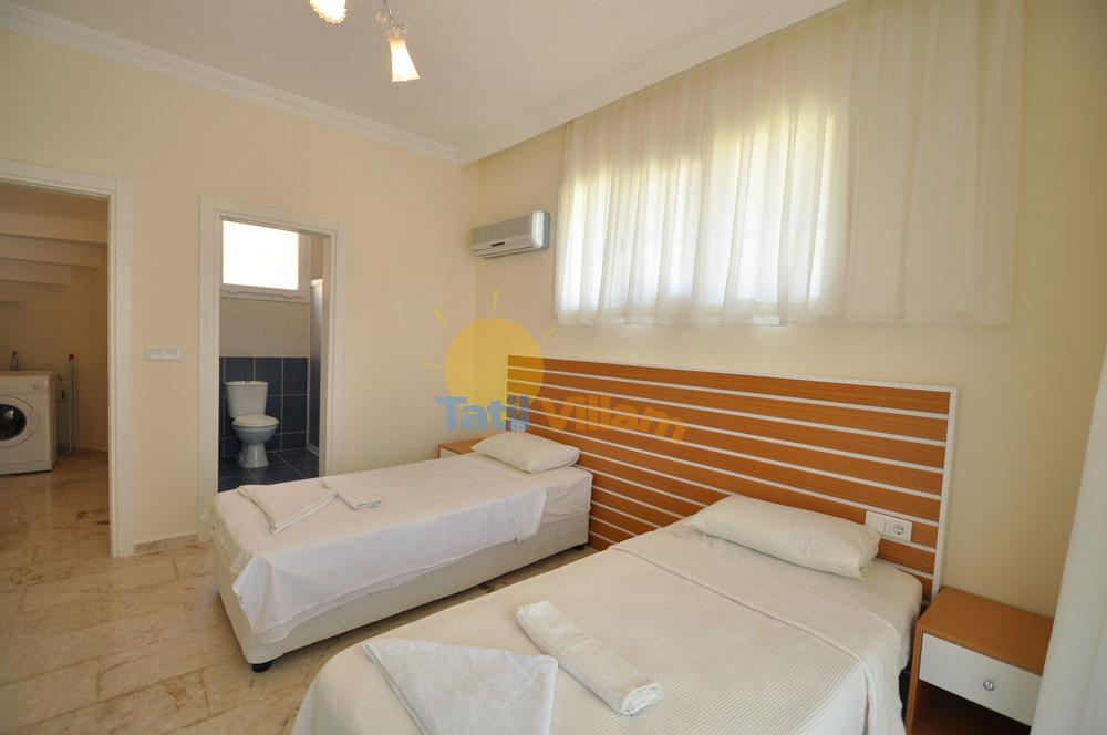1.Yatak Odası: Suit Genç Yatak Odası (Zemin Katta) Detayları: 2 adet tek kişilik yatak, Komidin, Klima, Elbise dolabı, Banyo ve Havuz cepheli balkon bulunmaktadır.