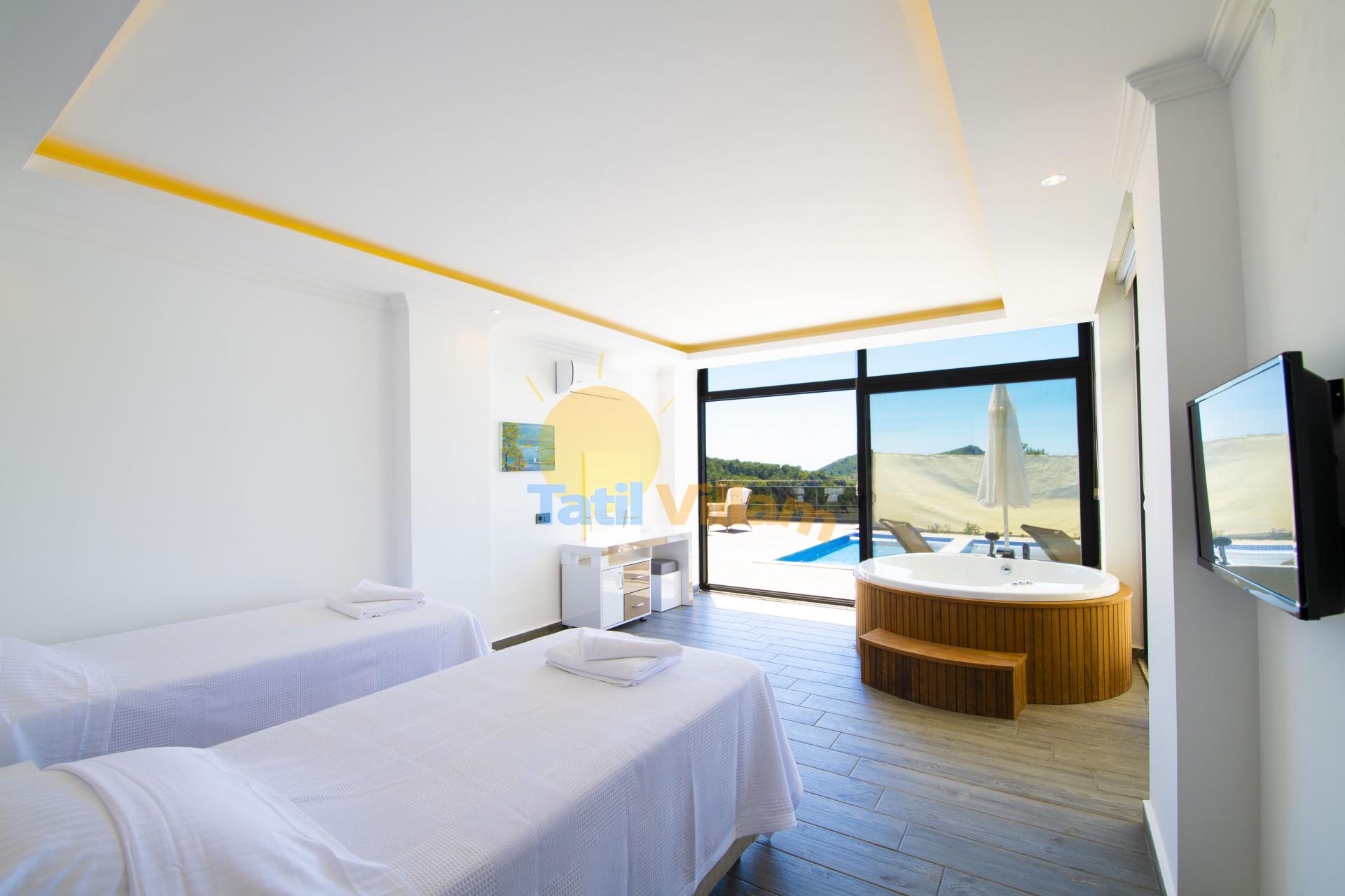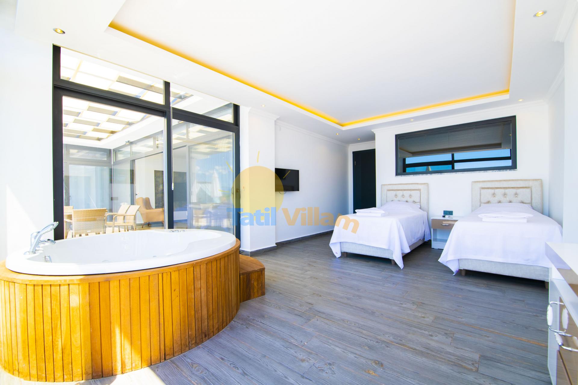 Detayları : 2 Adet tek kişilik yatak (birleştirilebilir) , Makyaj masası, Komodin, Klima, Elbise dolabı, TV, Jakuzi, Banyo, Havuz terasına çıkış bulunmaktadır.