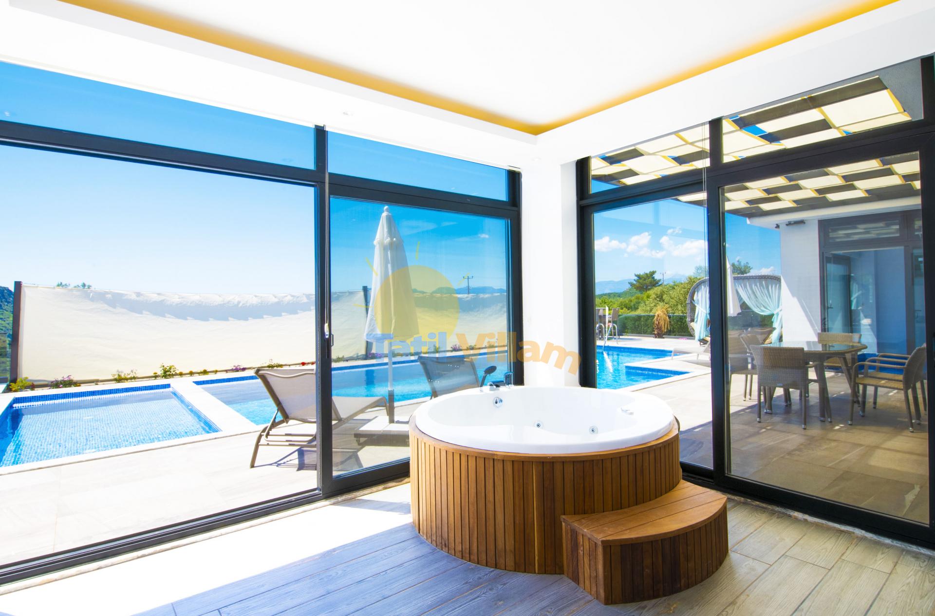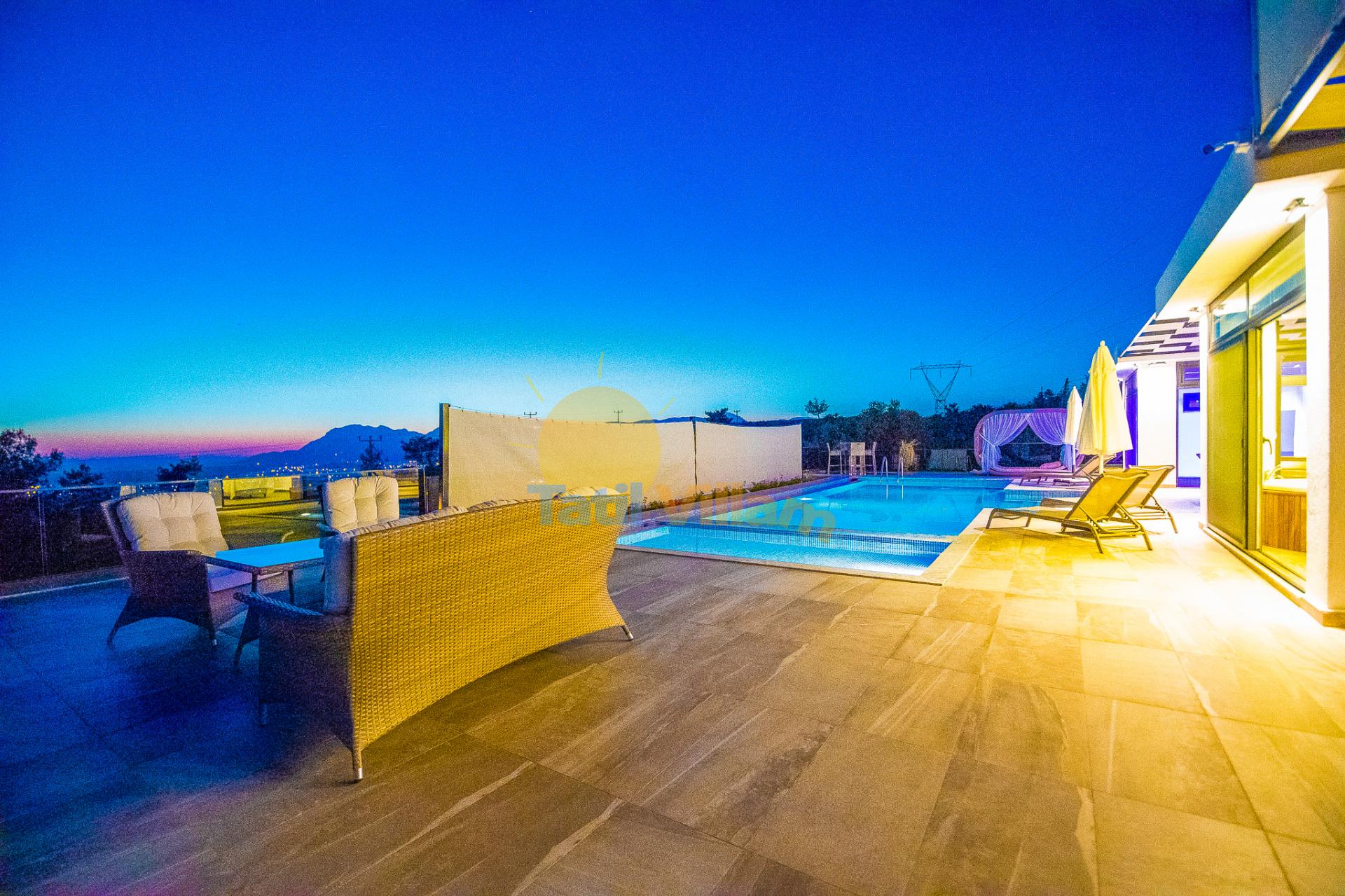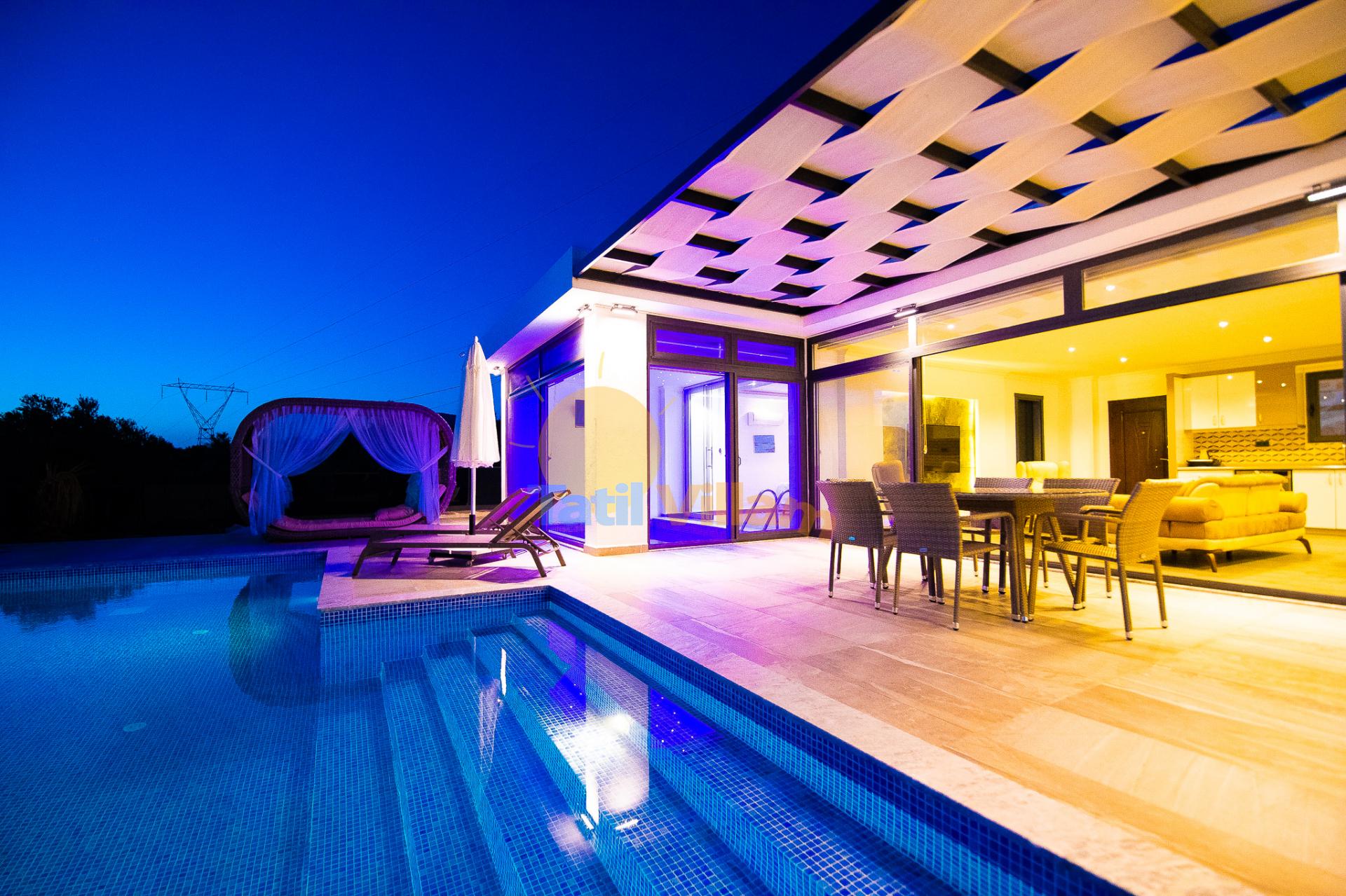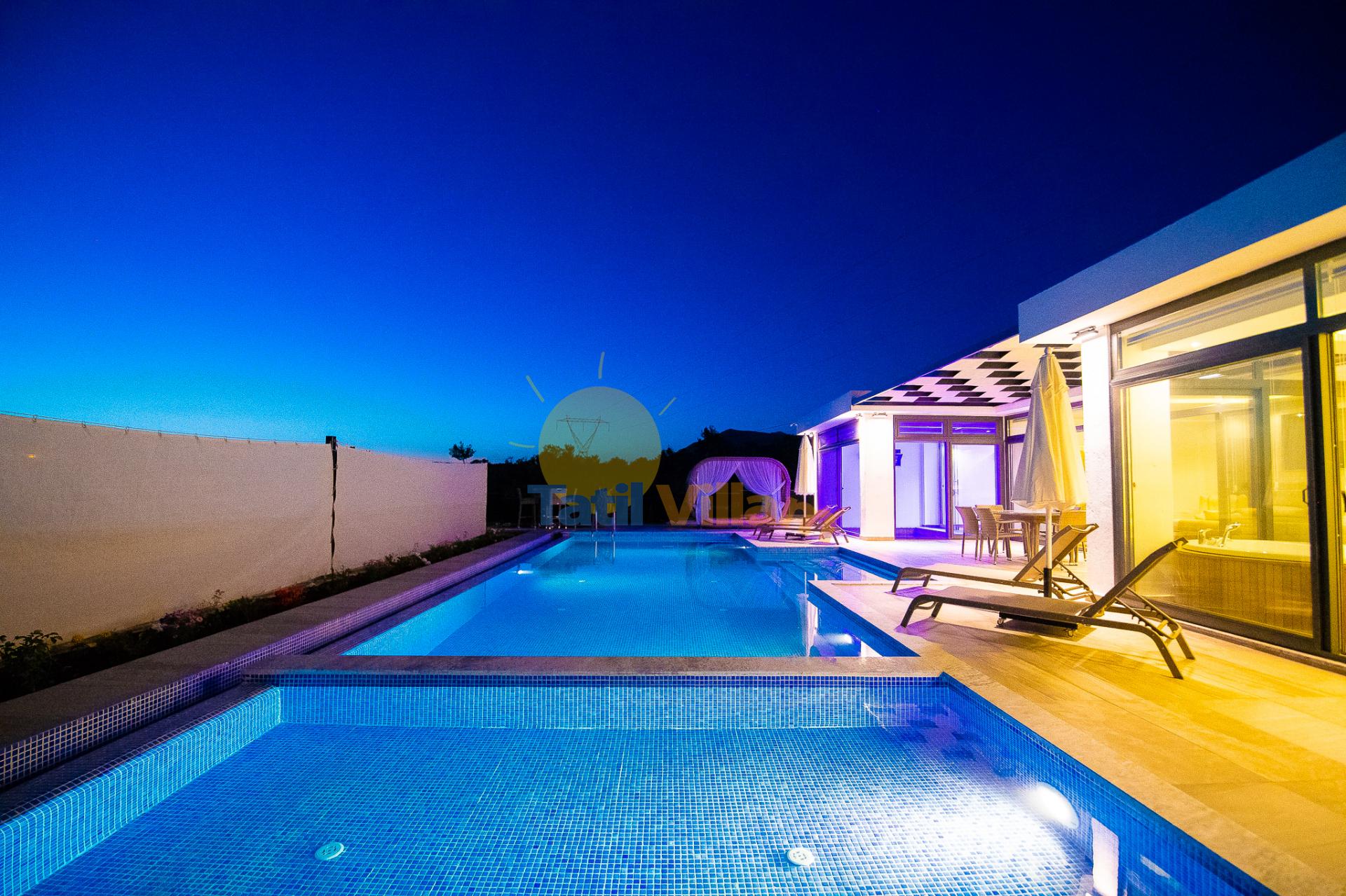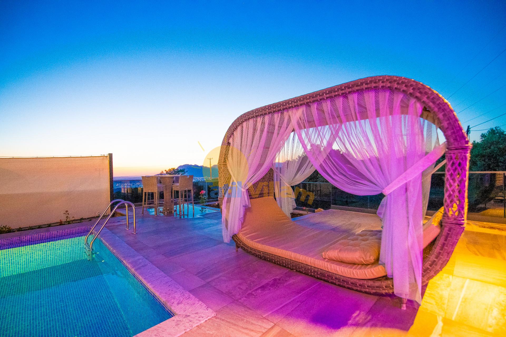 Villa Belçim, Kalkan Üzümlü köyünde bulunan doğanın sınırsızca tüm güzelliklerini sergilediği bir konumda sessiz, sakin, huzurlu bir ortamda tatilinizi yapabileceğiniz en güzel villalarımızdan bir tanesidir. Ferah ve konforlu bir salona sahip olan villamız oldukça şık ve kaliteli şekilde döşenmiştir. 1 adet çift kişilik ve 2 adet tek kişilik yatağı olan villamızın ebeveyn yatak odasında ısıtmalı kapalı yüzme havuzu ve genç yatak odasında jakuzi bulunmaktadır. Özellikle mutaassıp ailelerin ve balayı çiftlerinin gönül rahatlığı ile dinlenip hoş zaman geçirebileceği bir villadır. Yeşil ve mavinin ortasında tek katlı bu modern tatil evi, konum itibariyle havuz terası çok göz önünde değildir. Bütün bu özellikleri ile villamız , siz değerli misafirlerimize unutulmaz bir tatil yaşatmak için sizleri beklemektedir.