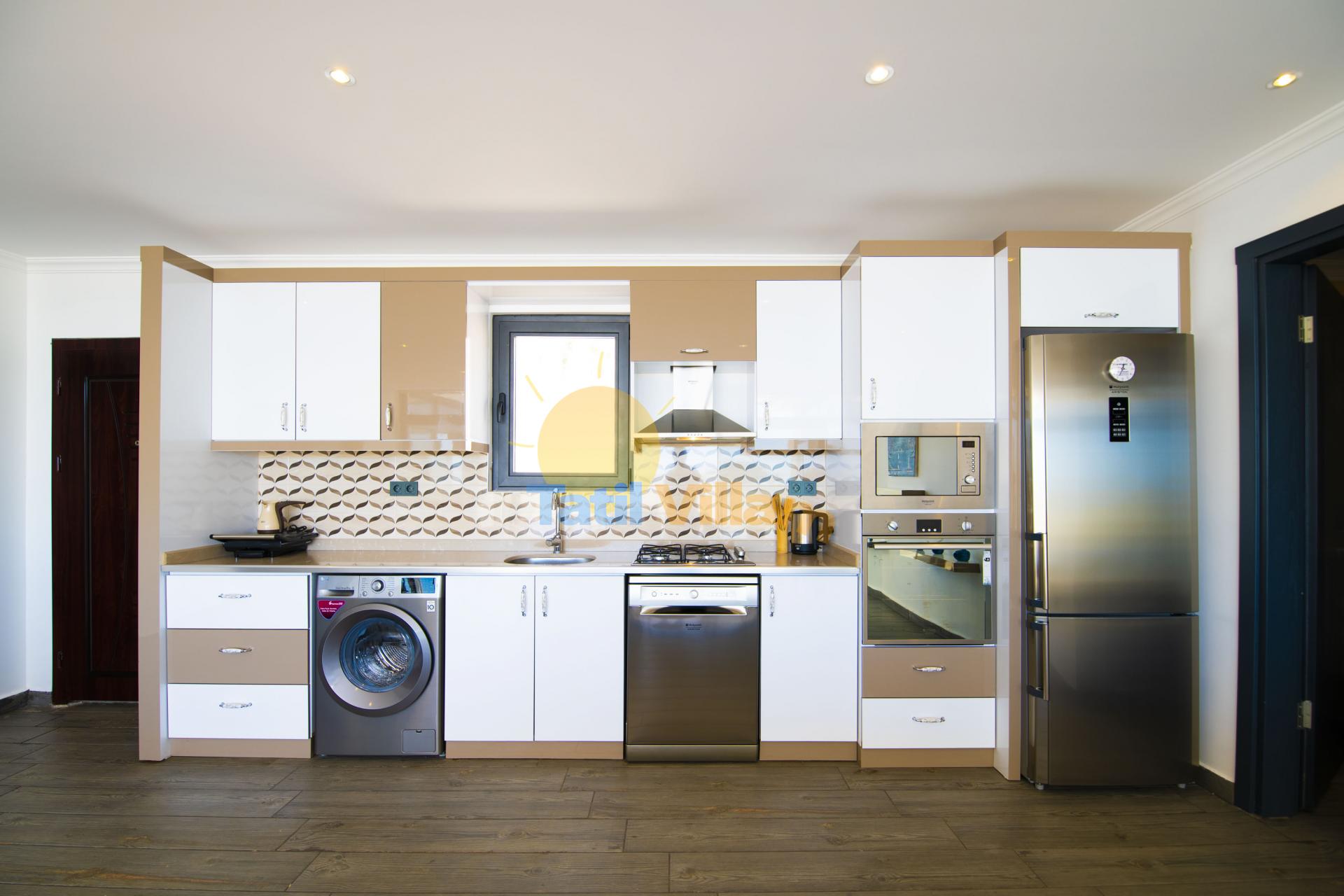 Detayları : Buzdolabı, Bulaşık makinesi, Çamaşır makinesi, Fırın, 4’lü Ocak (ankastre), Mikrodalga fırın, Elektrikli su ısıtıcı, 4 kişilik yemek takımı, Tava, Tencereler, Çatal bıçak vb.