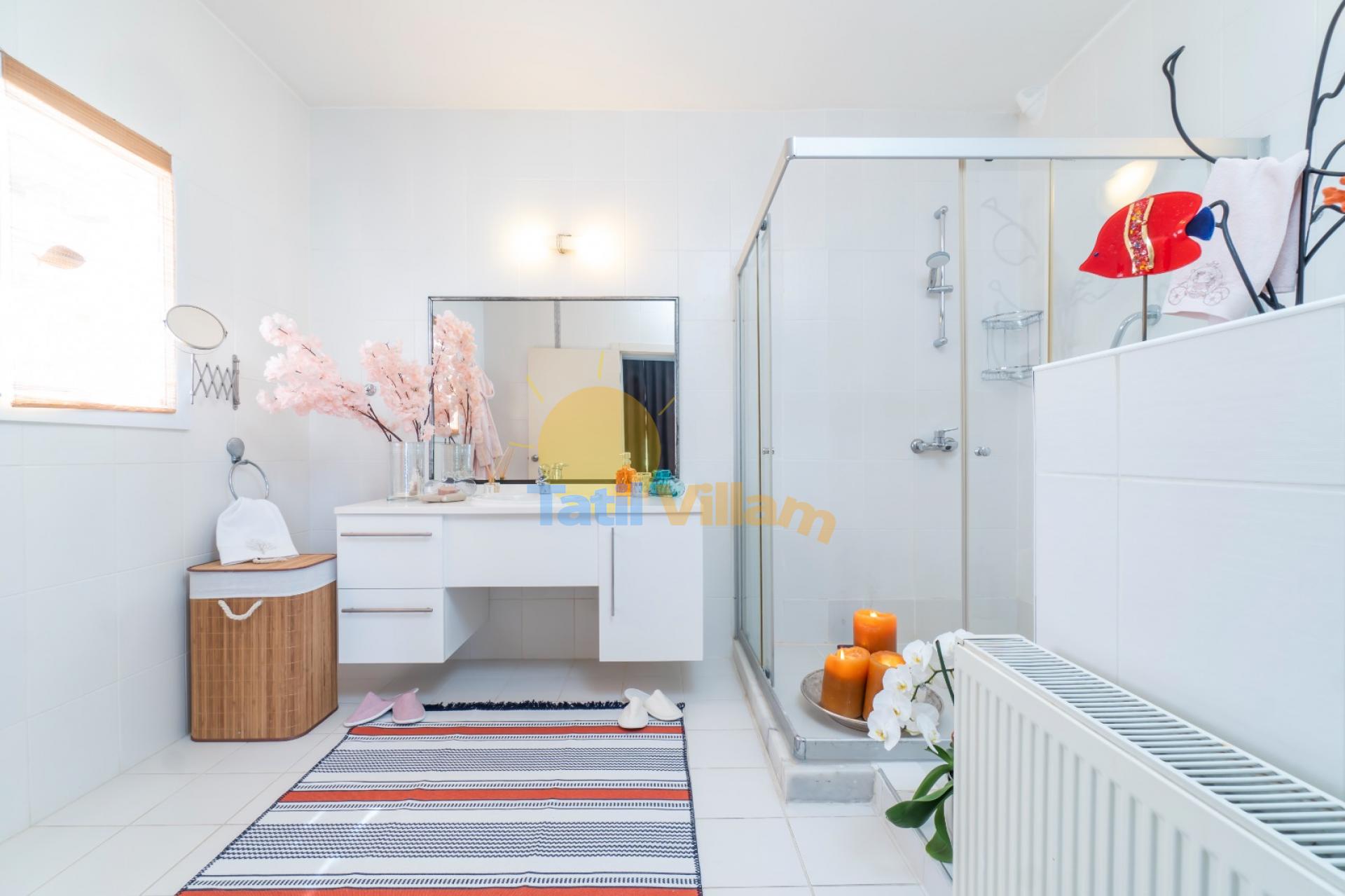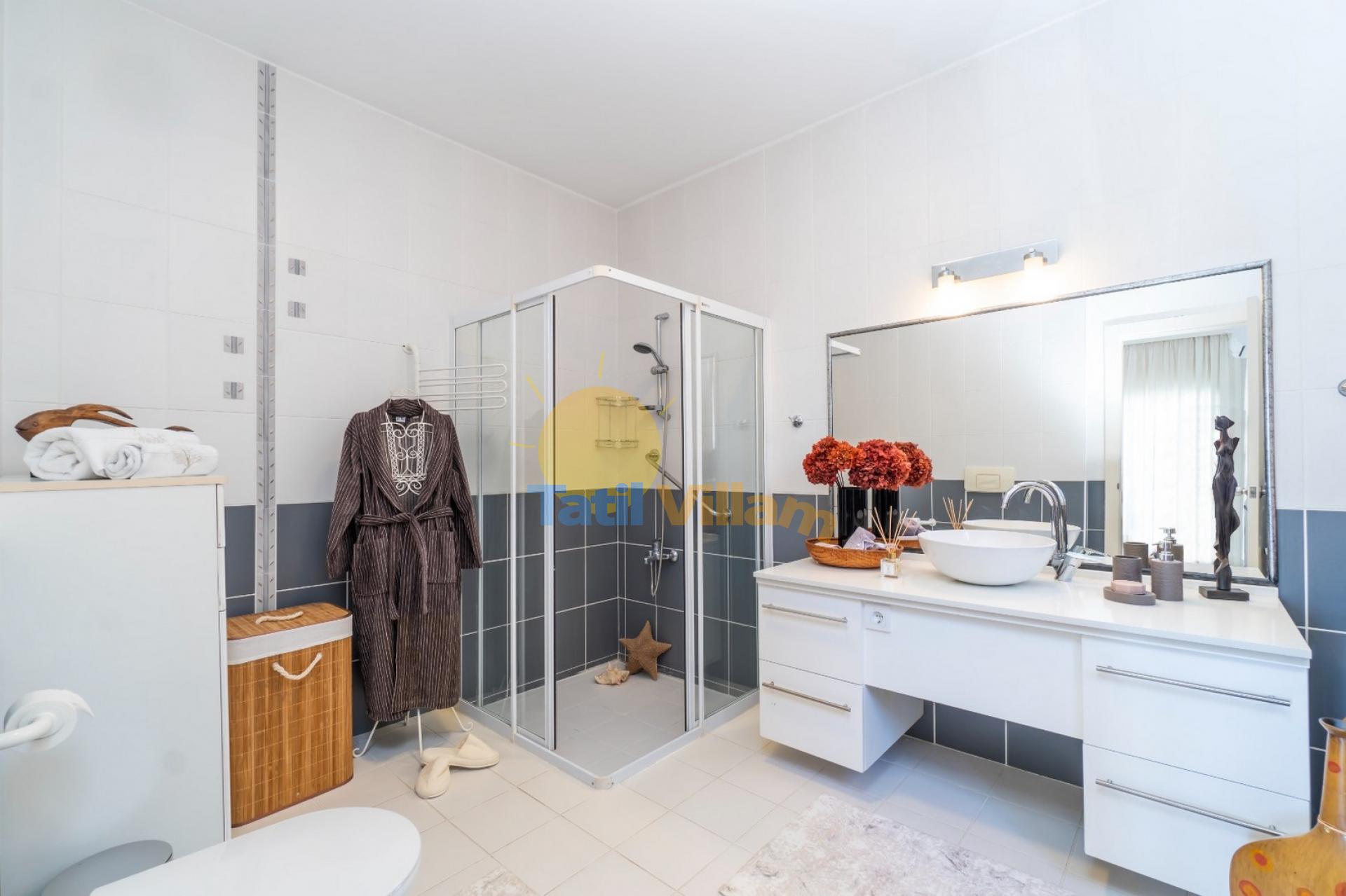 Not :Villamızın arkasında bulunan müştemilatta kalan yardımcı, hergün temizlik ,kahvaltı hazırlama, çamasır yıkama, bulasık yıkama ,market alışverişi gibi birçok ayrıcalıklı hizmeti vermektedir ve bu hizmet konaklama ücretine dahildir. (Yiyecek içecek alışveriş masrafları misafire ait olacaktır)