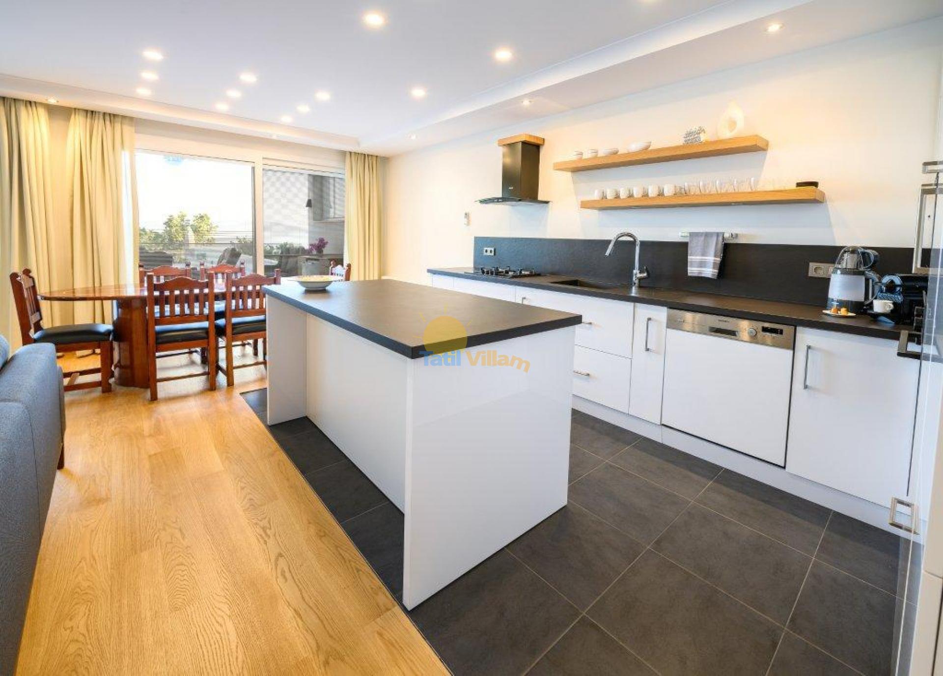 Detayları : Amerikan mutfakta buzdolabı, bulaşık makinesi, ankastre 4’lü ocak, davlumbaz, fırın, elektrikli su ısıtıcısı, esspresso makinesi, kahve makinesi, mutfak robotu, tava ve tencere takımı, 8 kişilik yemek takımı, çatal bıçak takımı, su ve çay bardağı takımları yer almaktadır. Mutfaktan havuz kenarına çıkış vardır.