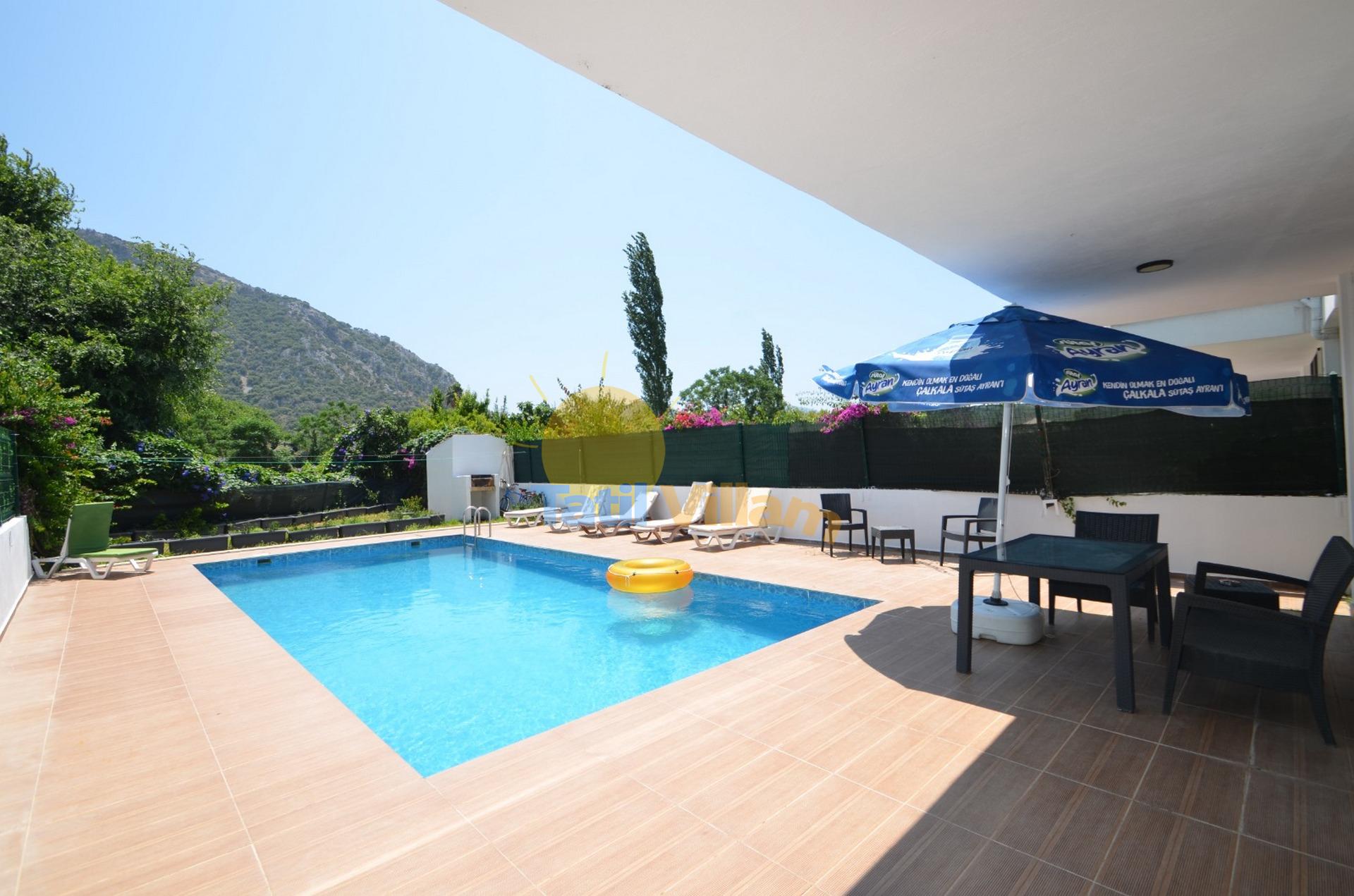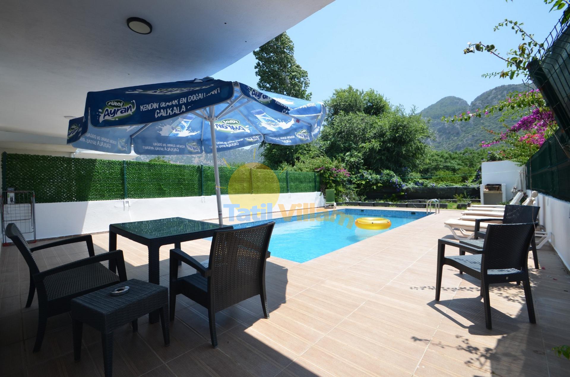 Detayları :4 Kişilik masa ve sandalye, 5 Adet şezlong, Özel yüzme havuzu, Mangal