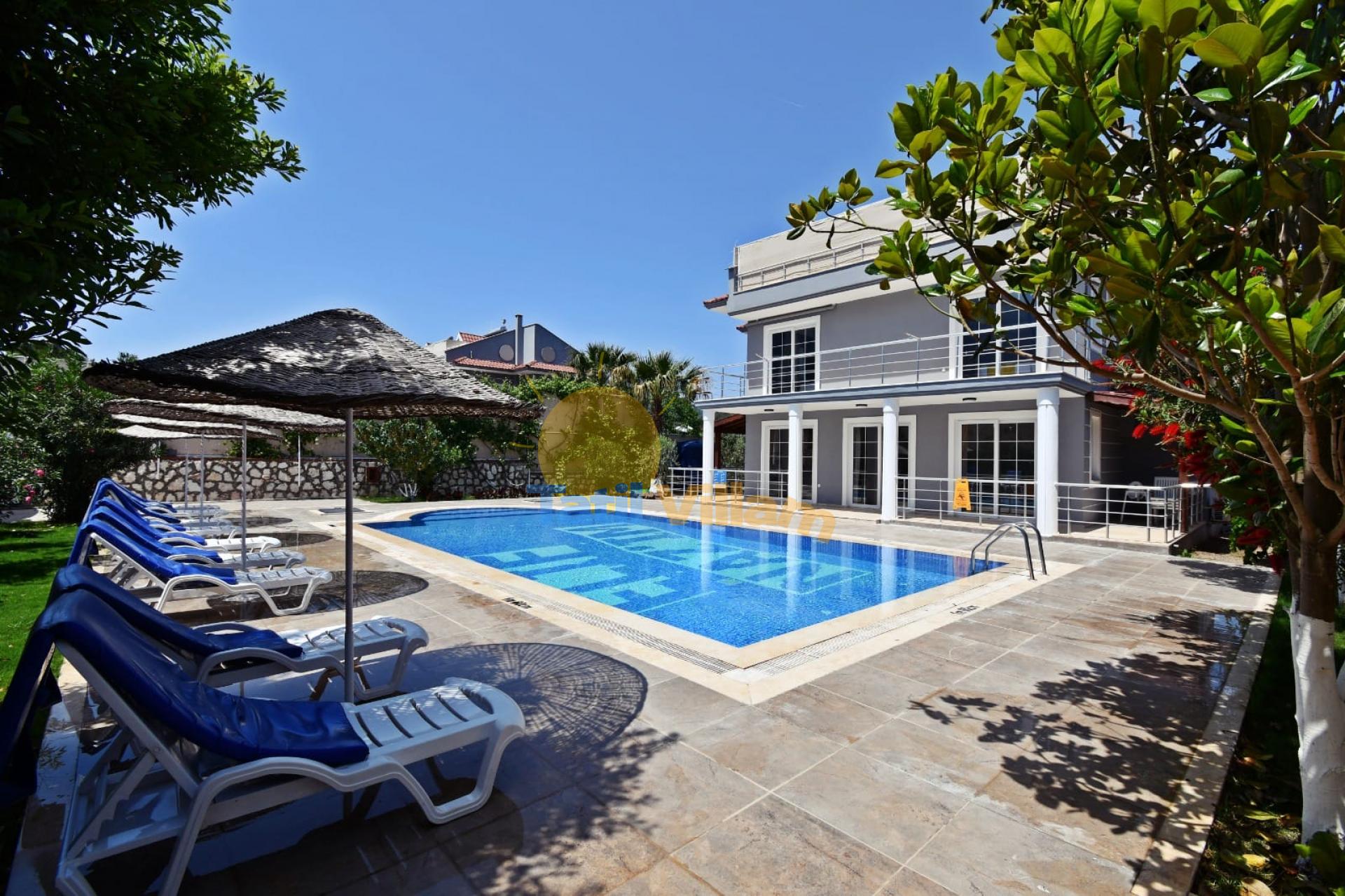 etayları : 10 kişilik masa ve sandalye, Özel yüzme havuzu, 7 Adet şezlong ve Güneş şemsiyesi bulunmaktadır.