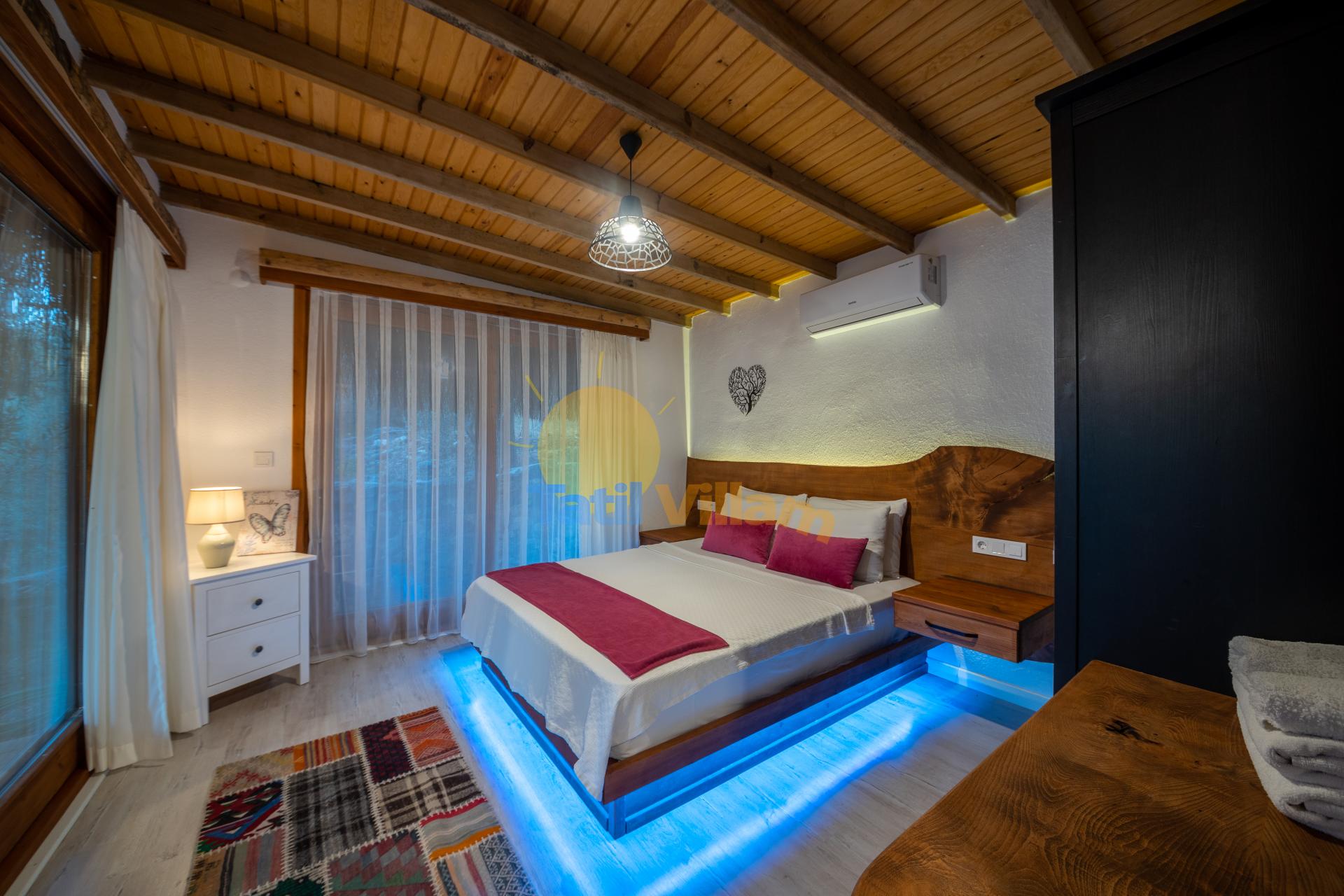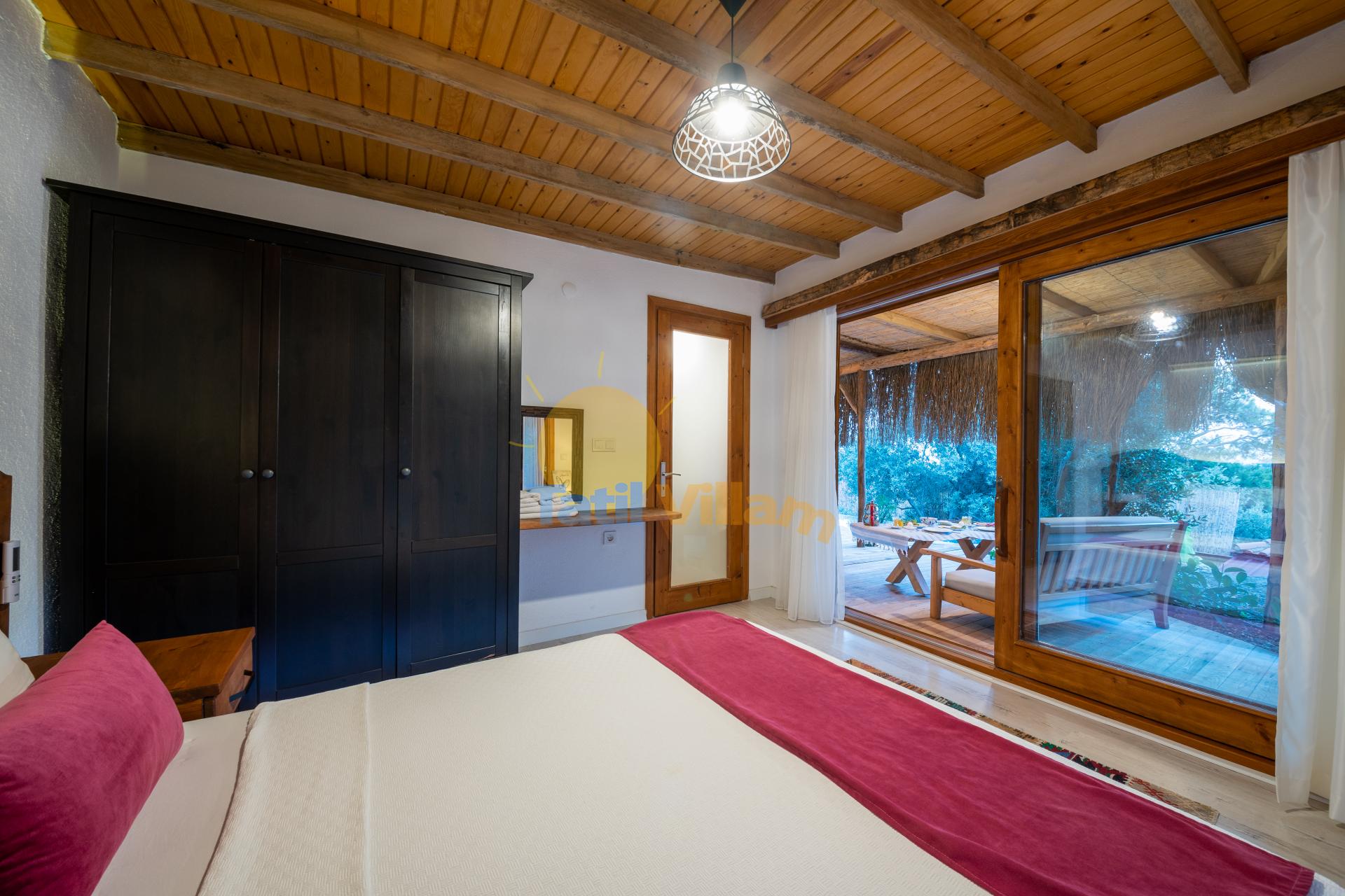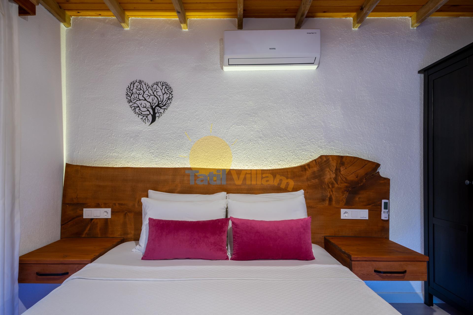 1. Yatak Odası : Çift kişilik yatak, Komidin, Klima, Elbise dolabı, Makyaj masası, Havuz terasına direkt çıkış bulunmaktadır.
