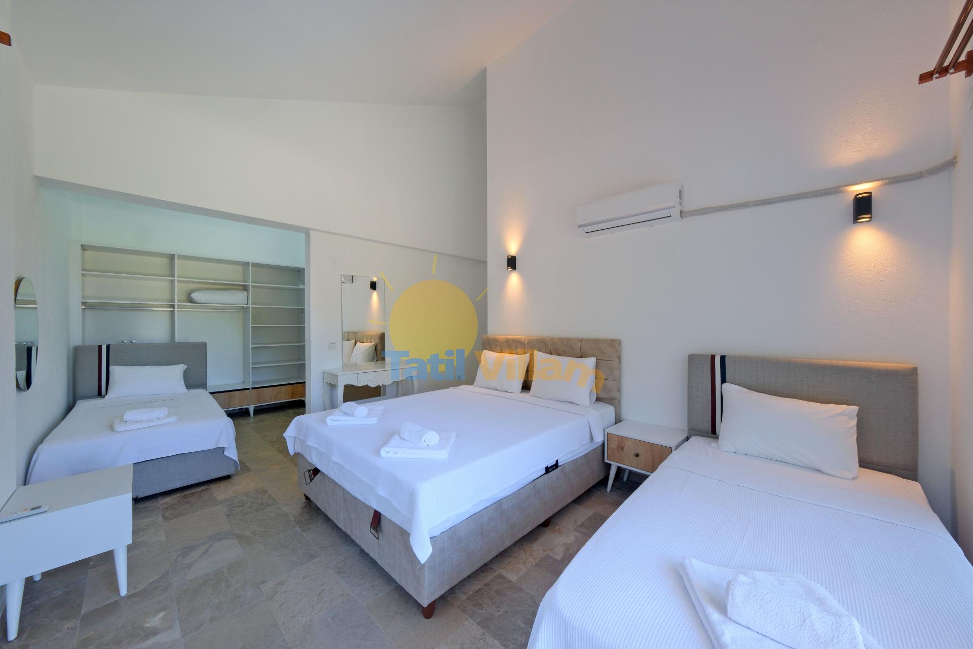 Detayları : Çift kişilik yatak, 2 tane tek kişilik yatak Komidin, Klima, Elbise dolabı, Makyaj masası, , Balkon, Banyo