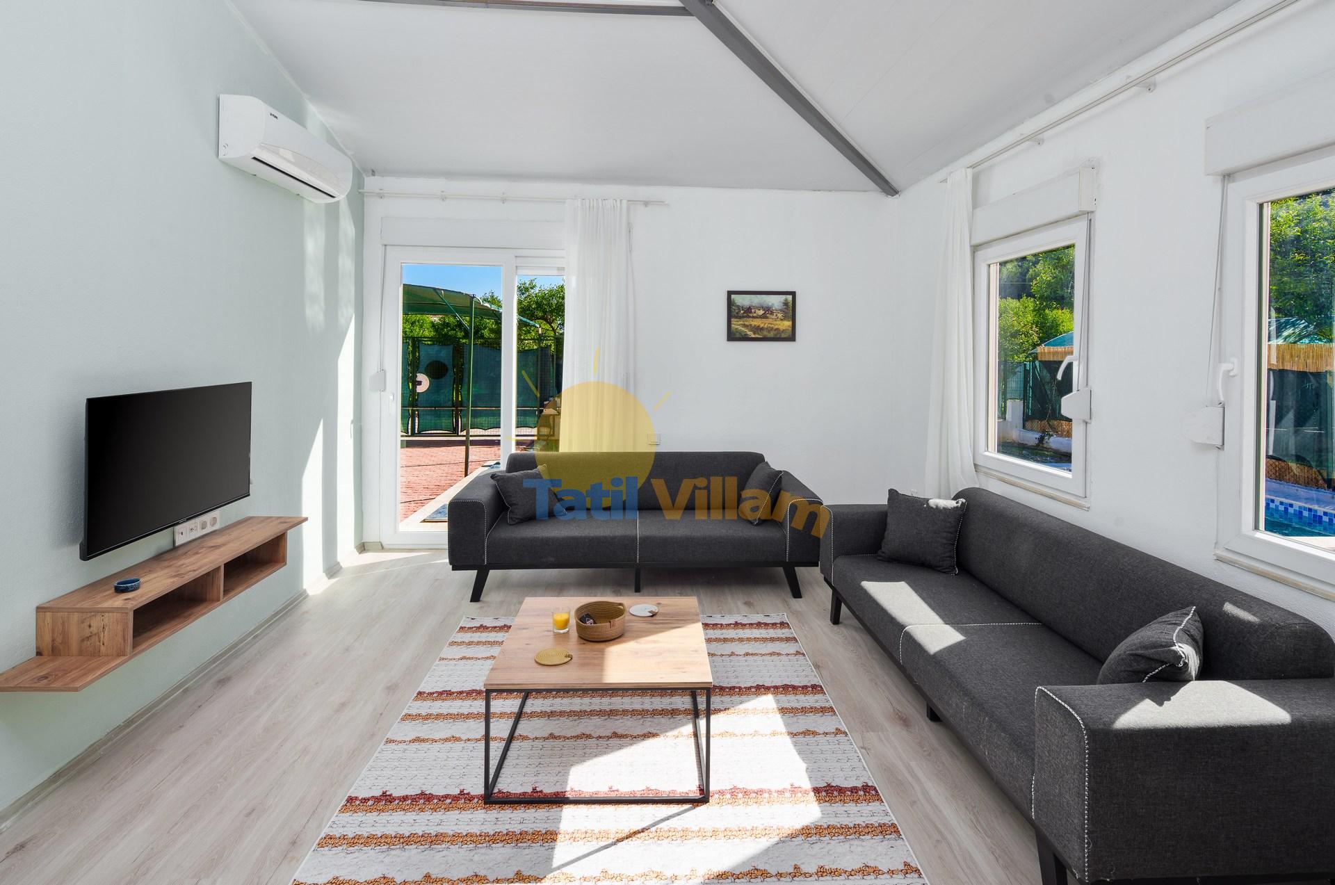 Detayları : Oturma grubu, Uydu TV, DVD Player, 6 Kişilik yemek masası, Klima, Havuz kenarına çıkış bulunmaktadır.