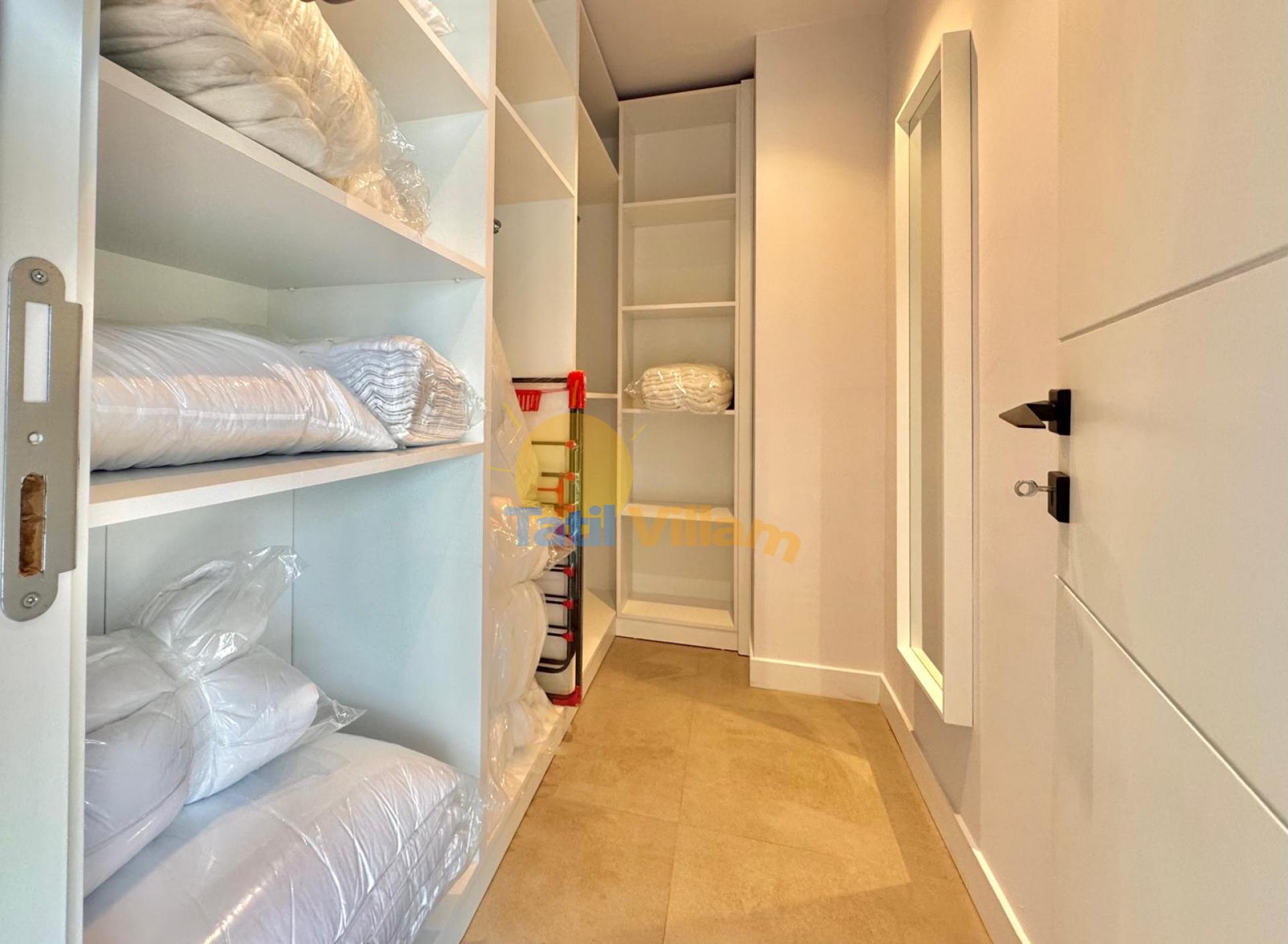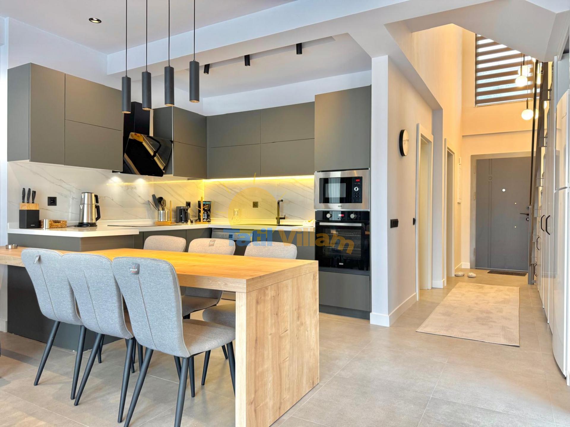 Detayları : Buzdolabı, Bulaşık makinesi, Çamaşır makinesi, Mikrodalga fırın, Elektrikli su ısıtıcısı, Fırın, 4 ’lü ocak, 6 kişilik yemek takımı, Tava, Tencereler, çatal, bıçak vb.