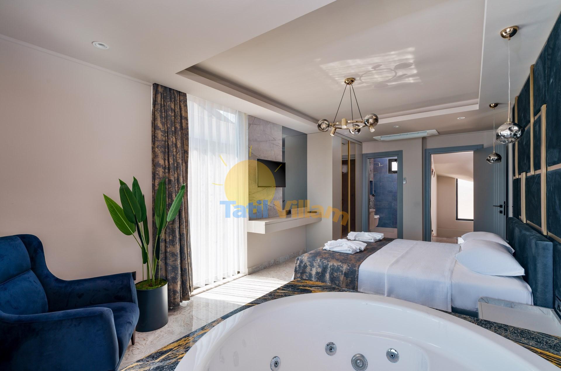 Detayları : Çift kişilik yatak, Komidin, Klima, Elbise dolabı, Makyaj masası, Bebek Yatağı, Banyo, TV, Jakuzi ve balkona çıkış bulunmaktadır.