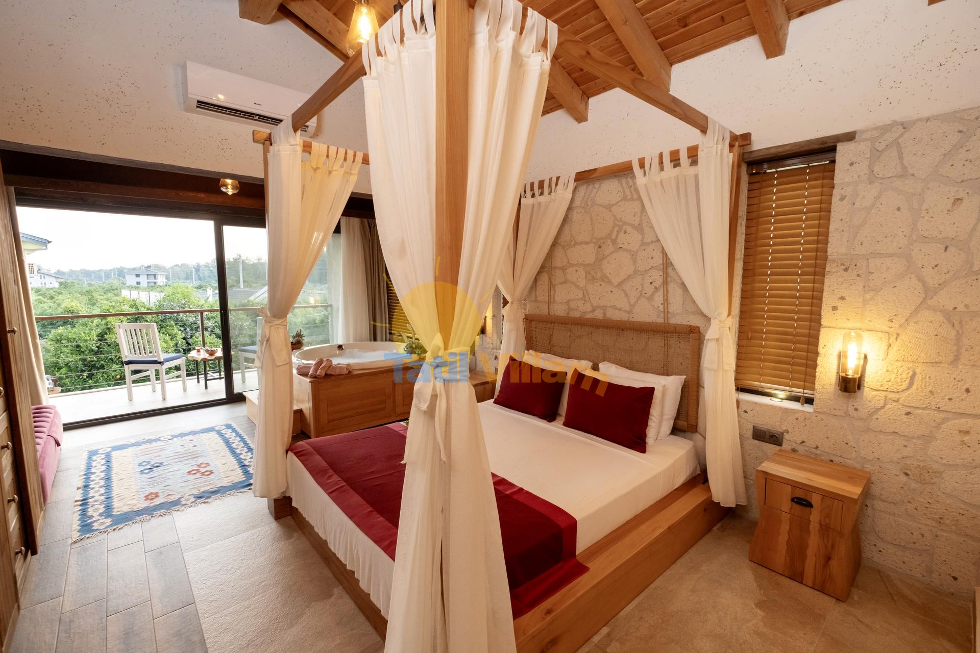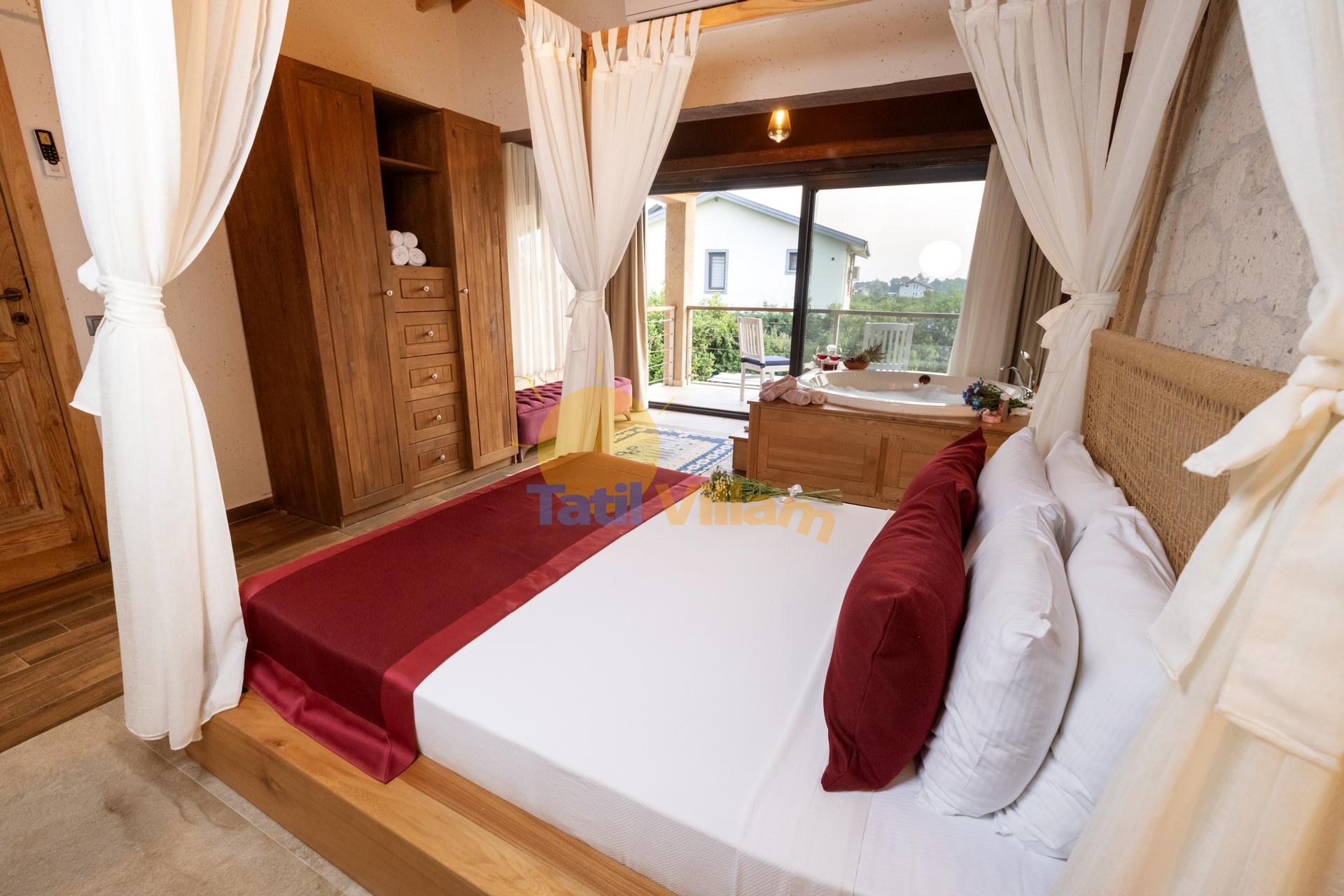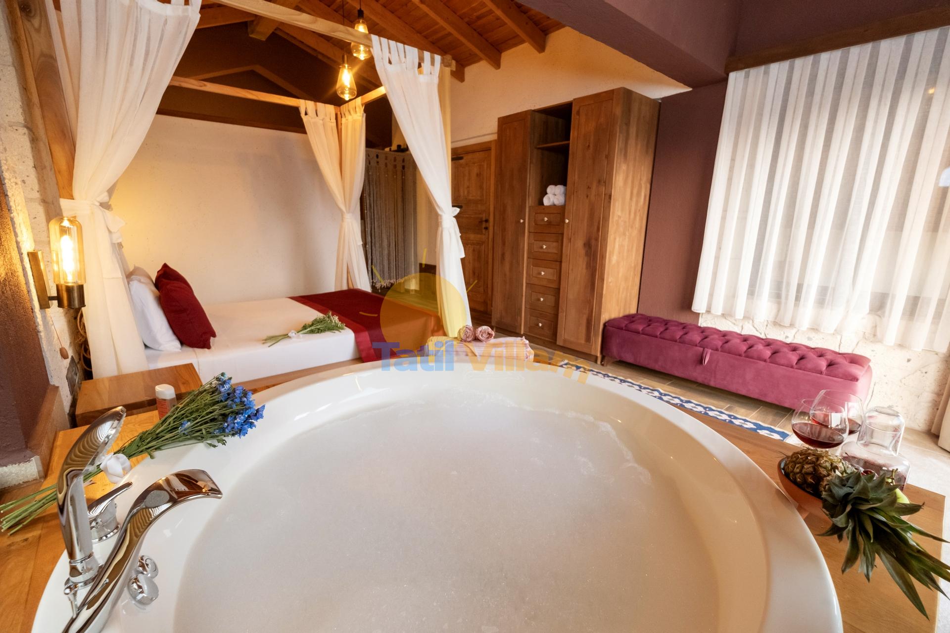 Detayları : Çift kişilik yatak, Komidin, Elbise dolabı, Klima, Jakuzi, Balkon ve Banyo bulunmaktadır.
