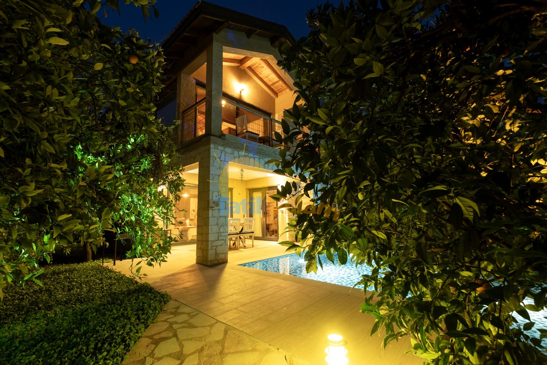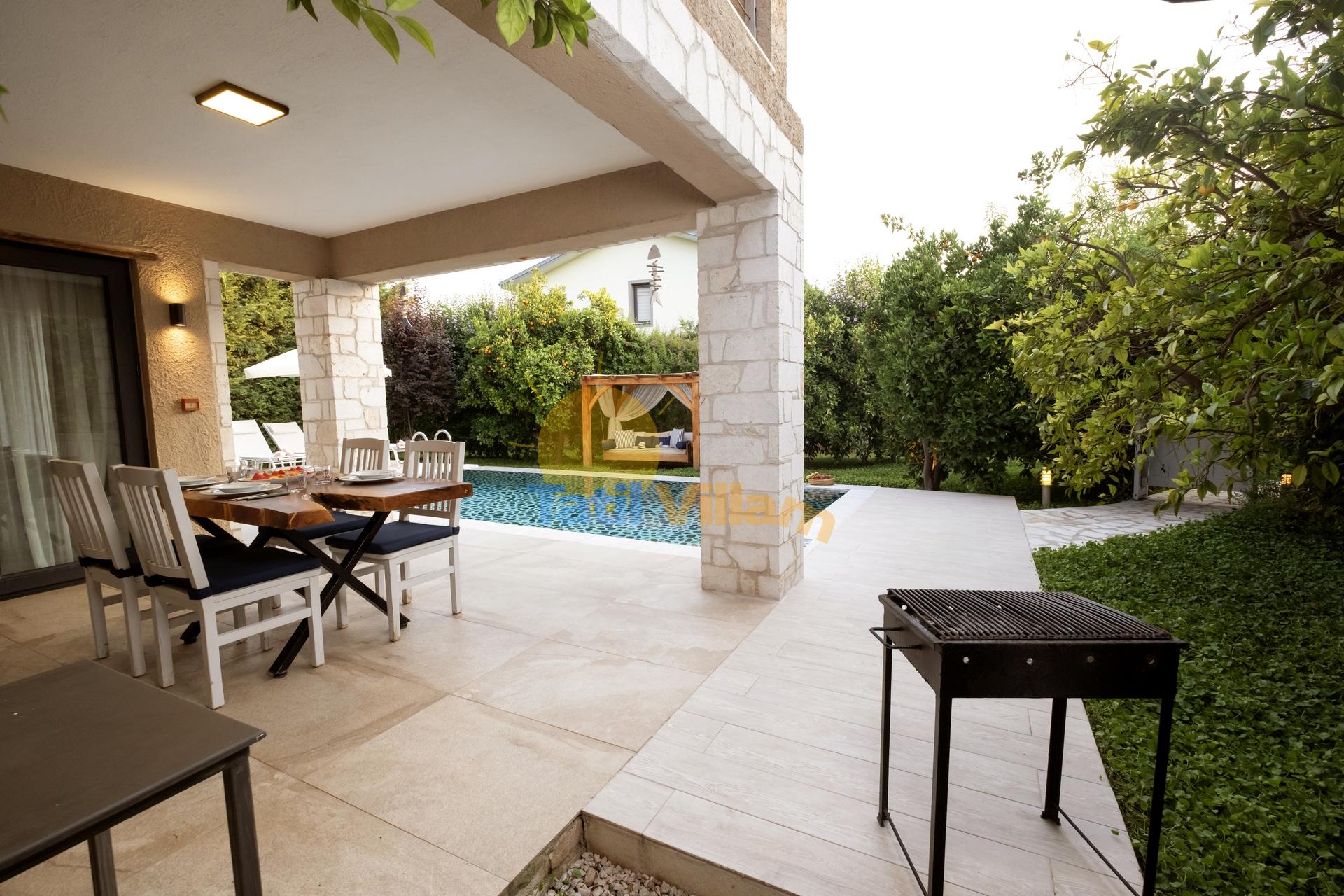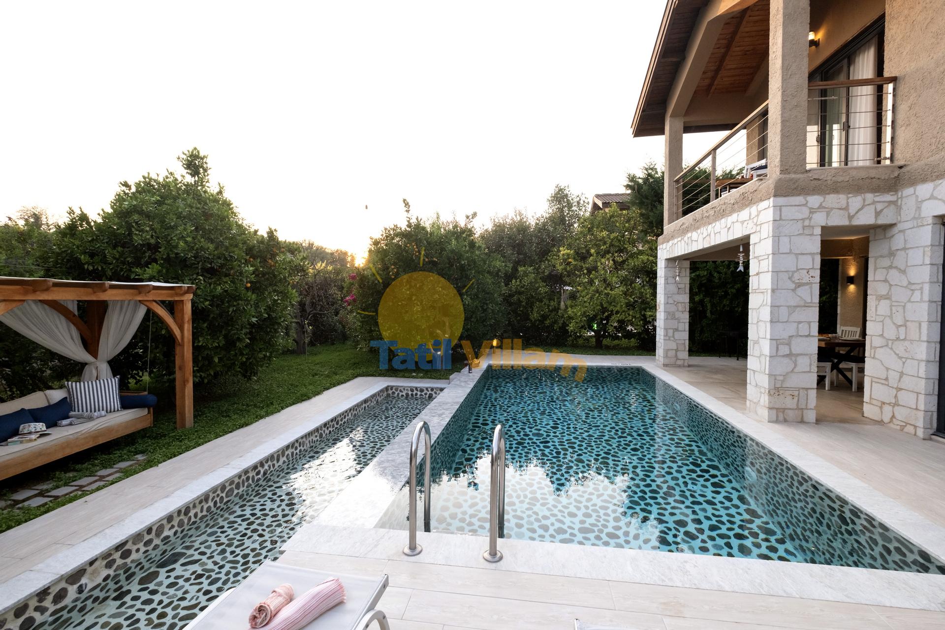 Fethiye de, denize sadece 900 mt. uzaklıkta konumlanmış bu şık jakuzili  villamız, yemyeşil portakal ağaçlarının arasında sessiz sakin bir bölgede yer alan, 4 kişilik konaklama kapasiteli özel bir villadır. Modern bir  mimari yapı ve dekorasyona sahip olan villamız, jakuzili suit balayı odası, suit genç yatak odası, açık mutfak + salon, özel bahçe, Özel havuz, Sığ havuz ve ferah kullanım alanlarıyla, sizlere rahatı ve konforu fazlasıyla sunacaktır. Gözlerden uzak huzur dolu bir tatil tecrübesi için villamız sizleri bekliyor.