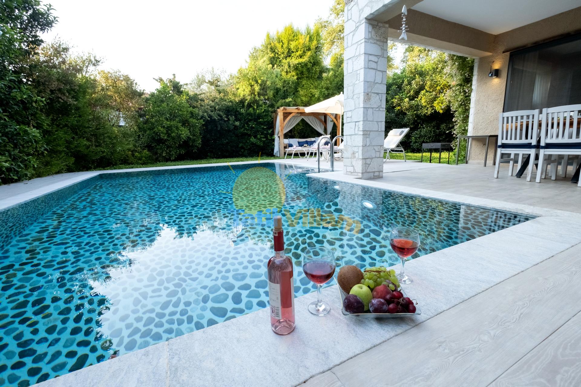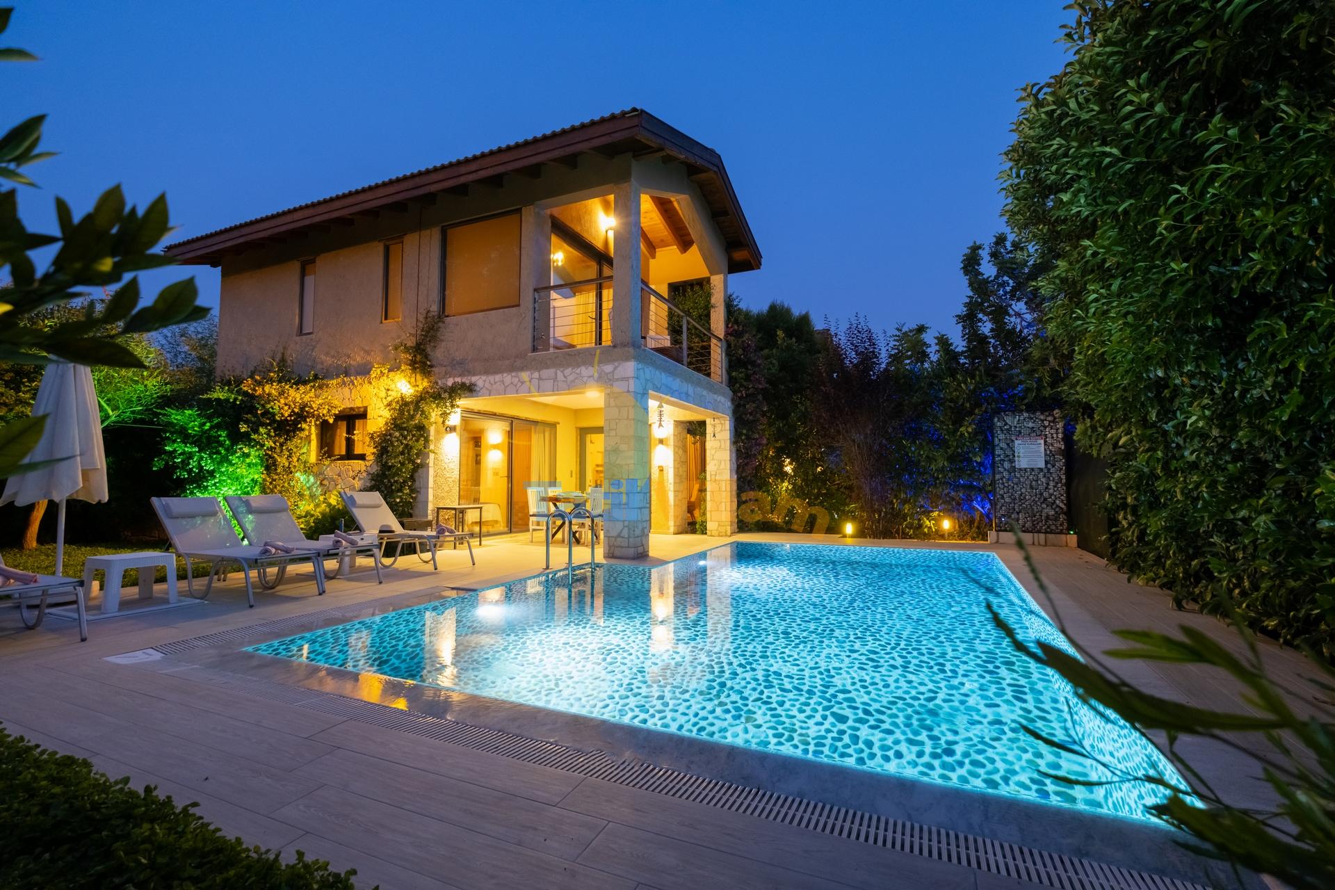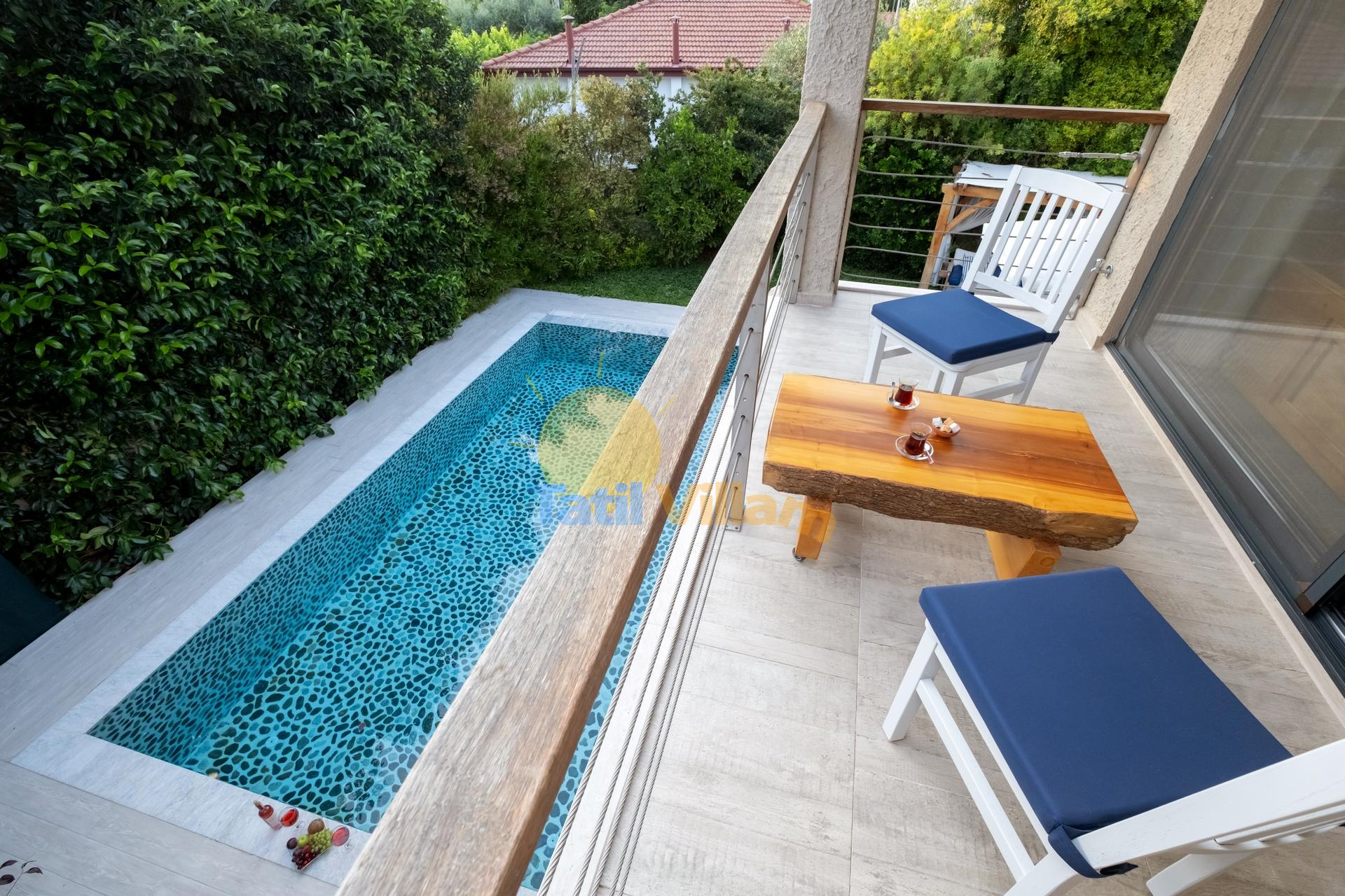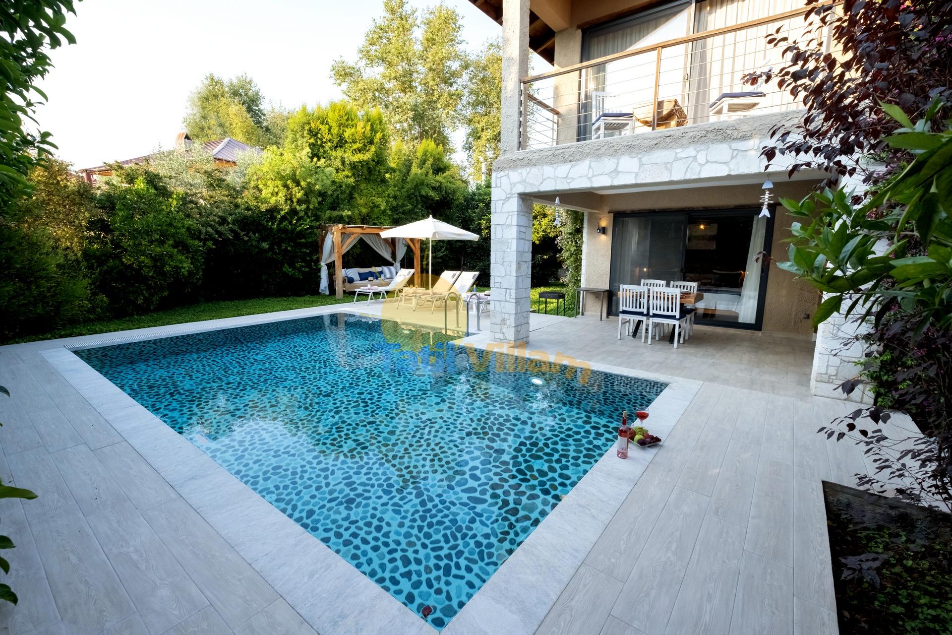 Fethiye de, denize sadece 900 mt. uzaklıkta konumlanmış bu şık jakuzili villamız, yemyeşil portakal ağaçlarının arasında sessiz sakin bir bölgede yer alan, 4 kişilik konaklama kapasiteli özel bir villadır. Modern bir mimari yapı ve dekorasyona sahip olan villamız, jakuzili suit balayı odası, suit genç yatak odası, açık mutfak + salon, özel bahçe, Özel havuz, Sığ havuz ve ferah kullanım alanlarıyla, sizlere rahatı ve konforu fazlasıyla sunacaktır. Gözlerden uzak huzur dolu bir tatil tecrübesi için villamız sizleri bekliyor.