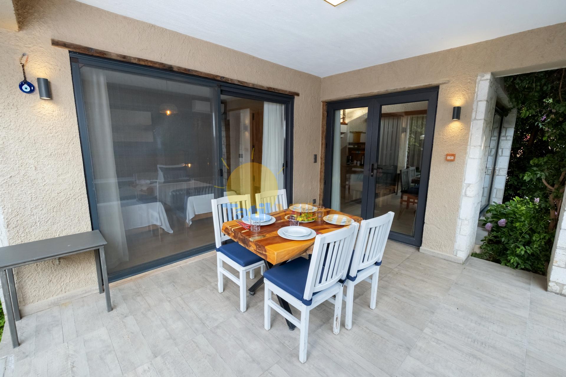 Detayları : 4 adet şezlong, Güneş Şemsiyesi, 4 Kişilik masa ve sandalye, Mangal, Açık duş
