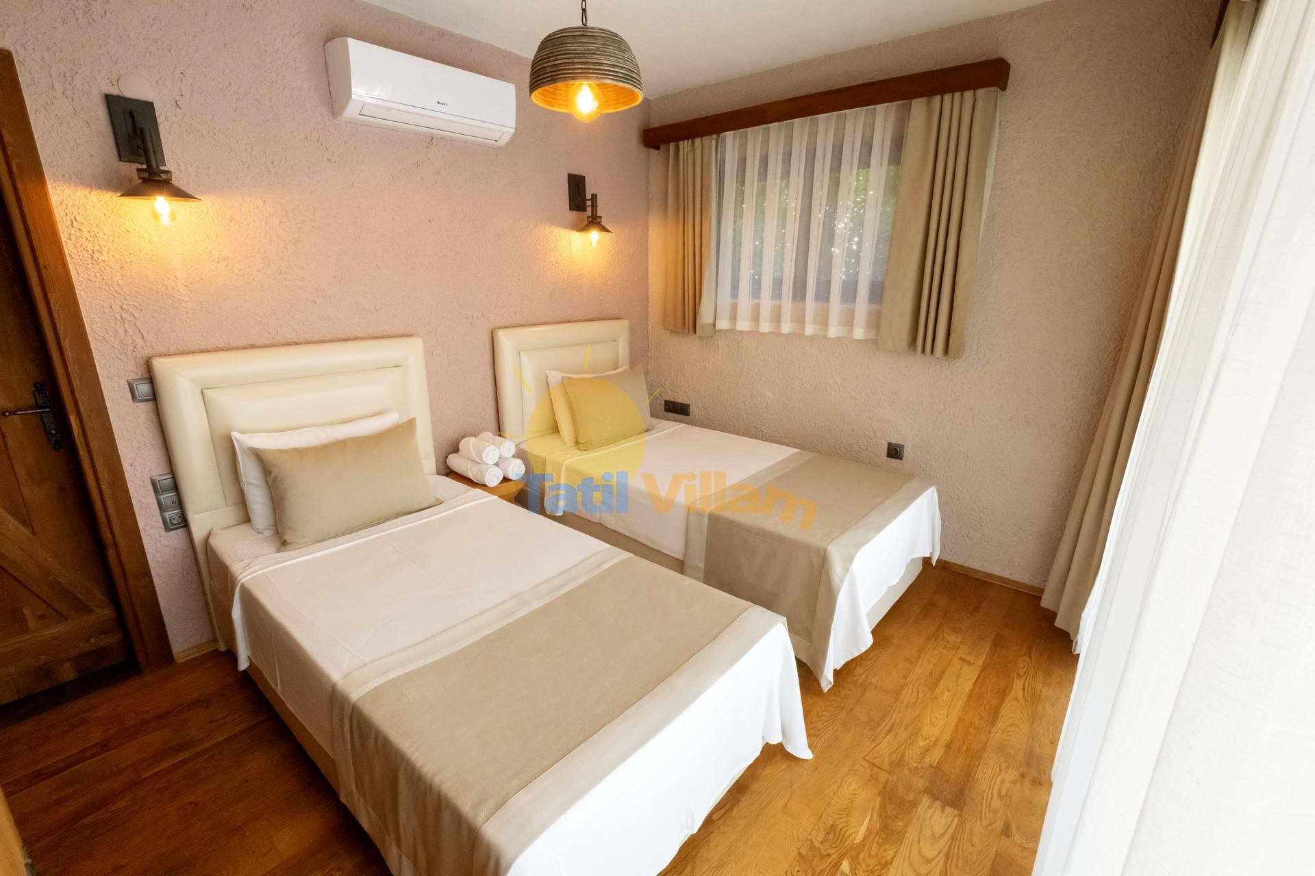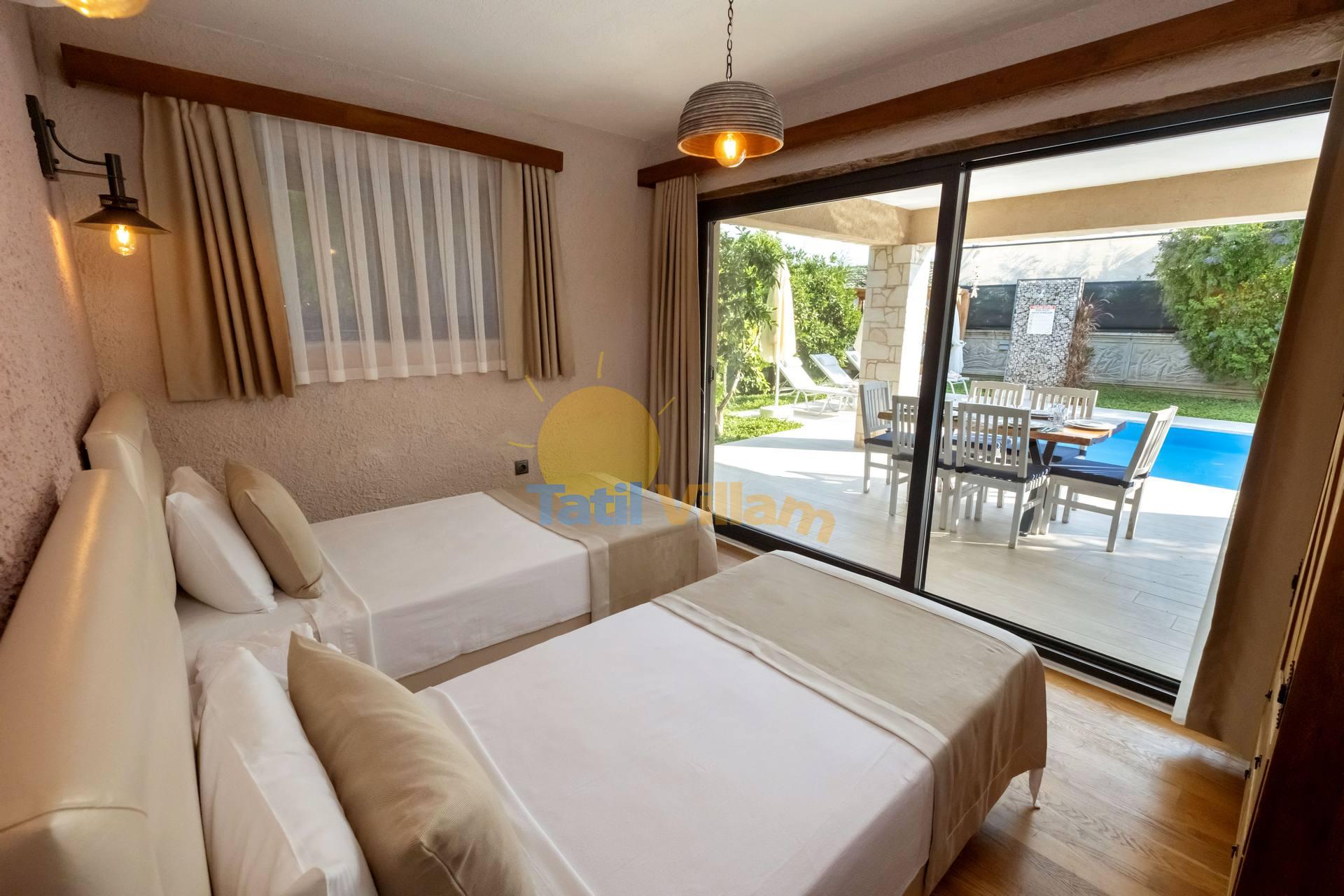 Detayları : İki kişilik yatak, Komidin, Elbise dolabı, Klima ,Banyo ve havuz terasına çıkış bulunmaktadır.