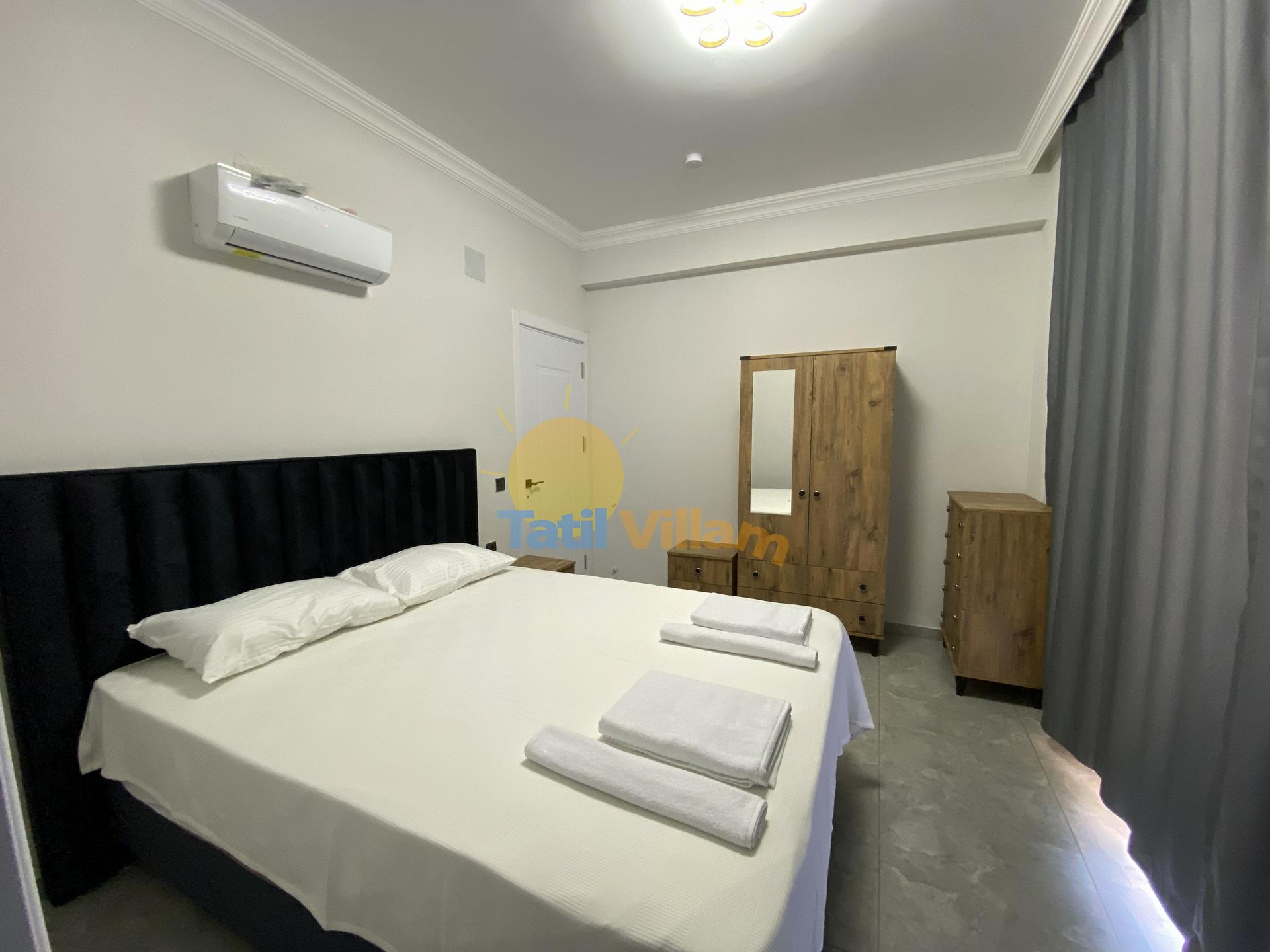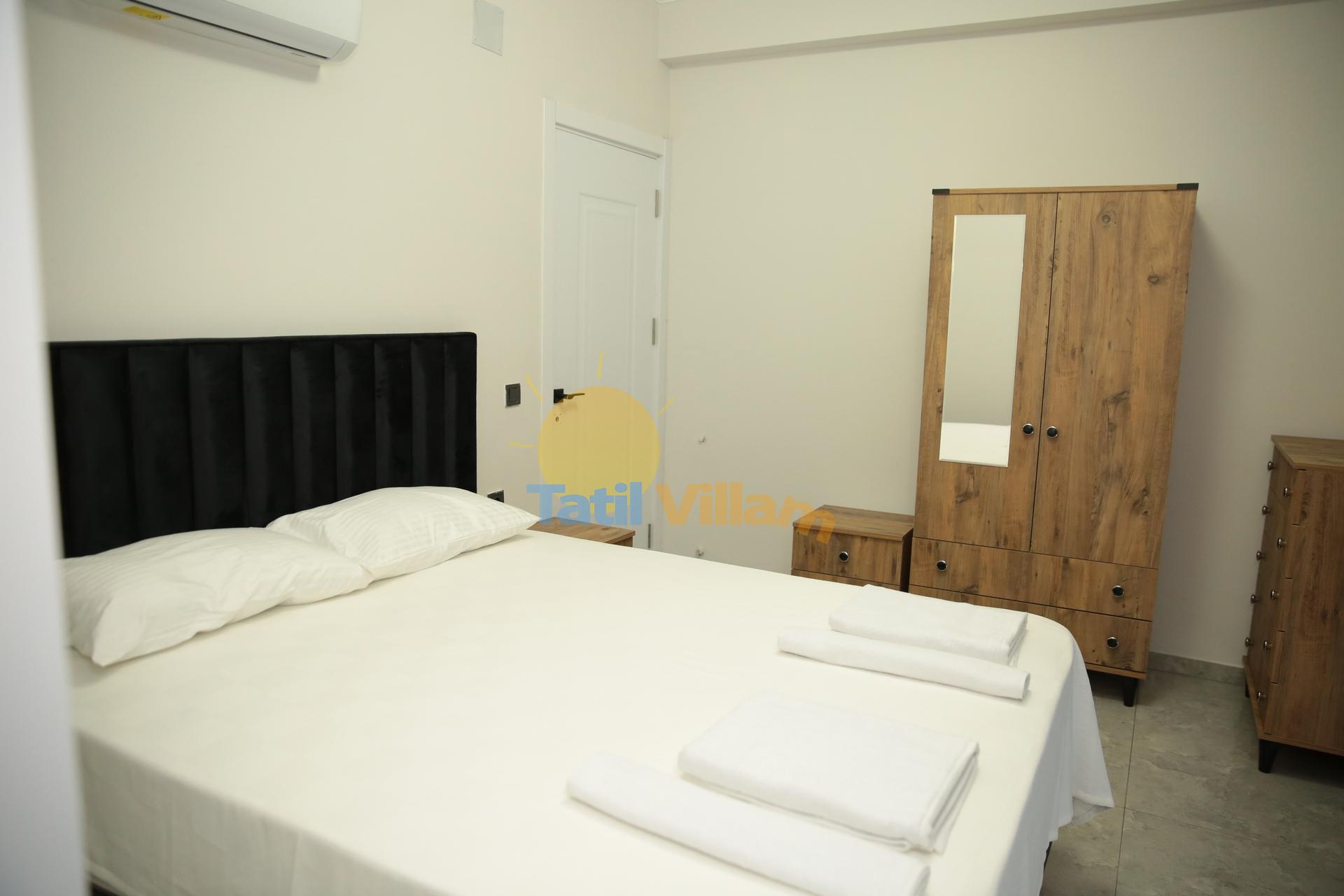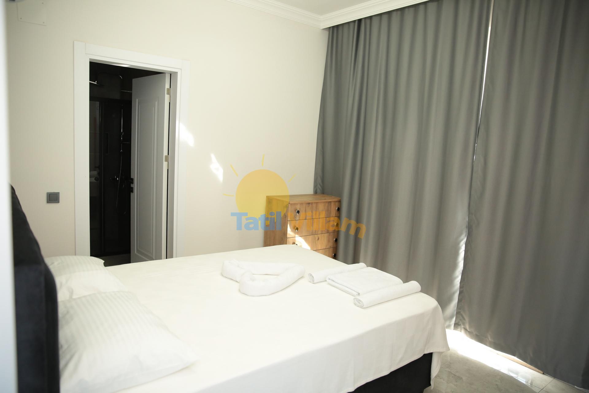 Detayları : Klimalı süit yatak odasıdır. Yatak odası içerisinde 1 adet çift kişilik yatak, şifonyer, 2 adet komodin, elbise dolabı ve ebeveyn banyosu bulunmaktadır.