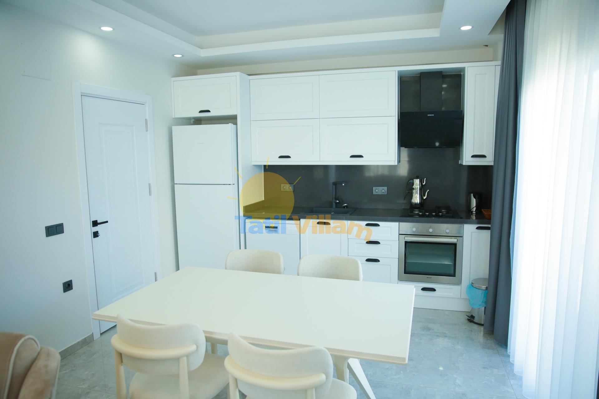 Detayları : Buzdolabı, bulaşık makinası, çamaşır makinası, ankastre ocak, ankastre fırın, elektrikli su ısıtıcı kettle, kahve makinası, 10 kişilik yemek takımı, kaşık ve çatal takımı, tencere ve tava takımı, fincan takımı, bardaklar (çay,su,nescafe ve rakı) bulunmaktadır.